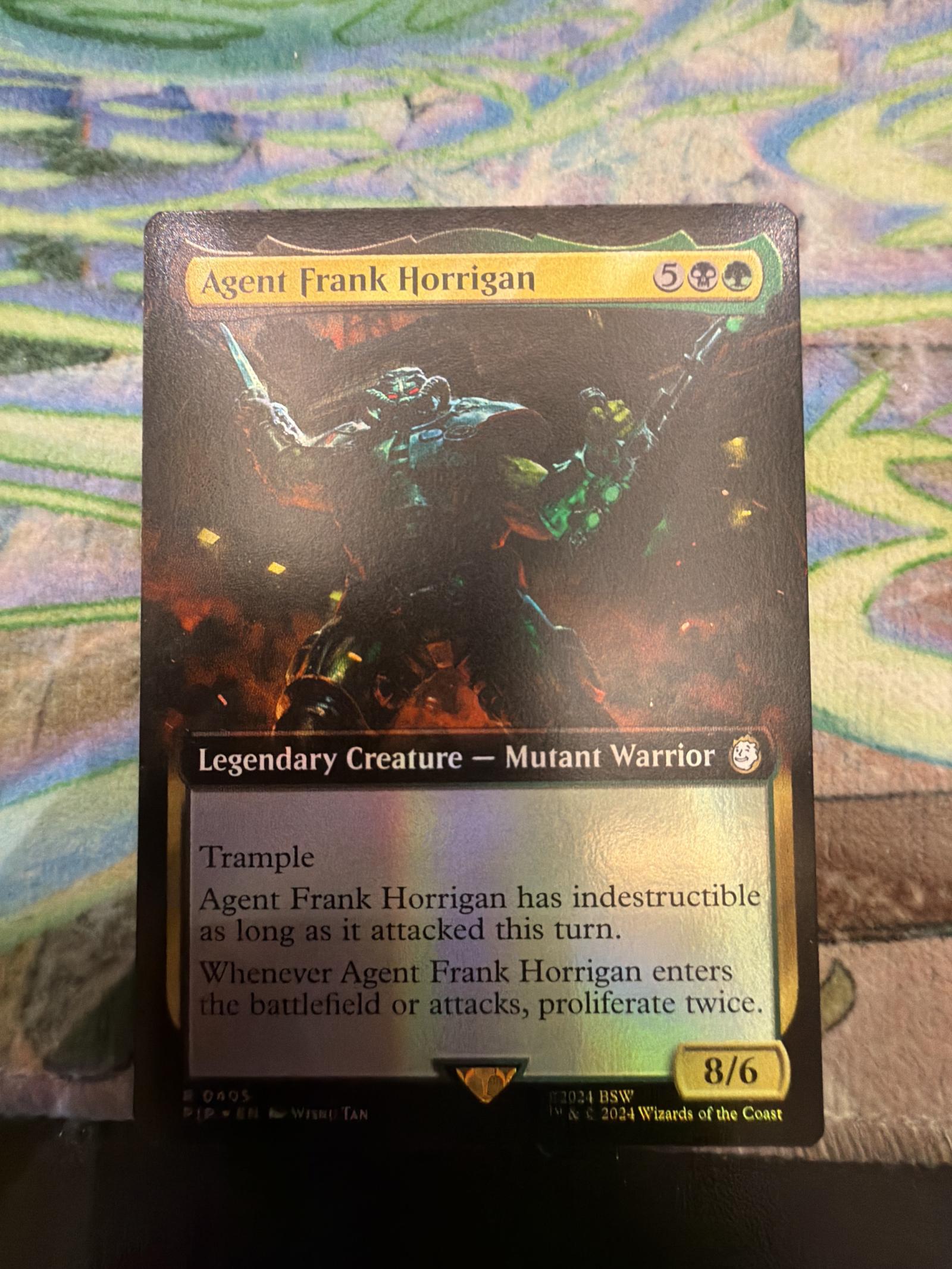 Agent Frank Horrigan is a legendary creature card from the BSW set, illustrated by Wisnu Tan. This foil version features trample, indestructible when attacked, and proliferate twice abilities. It is playable in current Magic: The Gathering meta decks, especially in proliferate strategies.