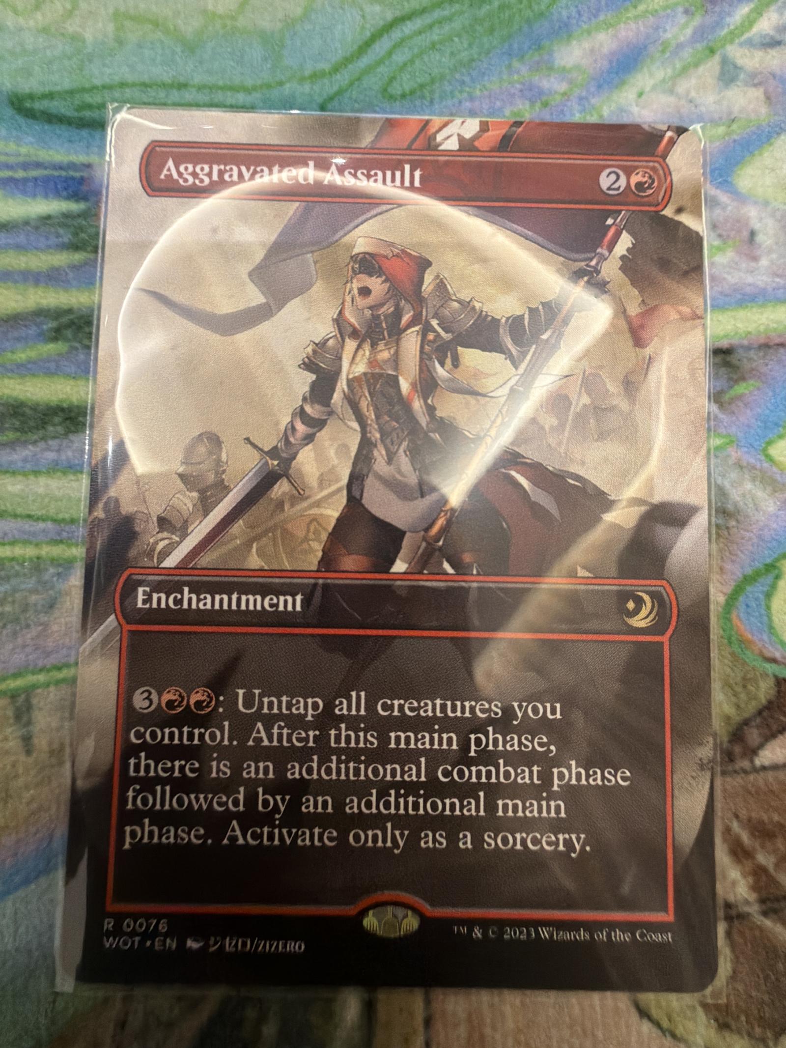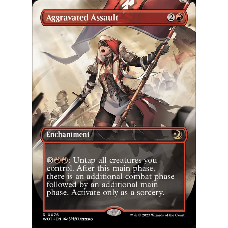 Aggravated Assault from the Magic: The Gathering set Wilds of Eldraine (WOT). This red enchantment allows untapping all creatures for an additional combat phase, only playable as a sorcery. Card number 76, artist Izuro. The card is in English and has a normal (non-foil) printing.