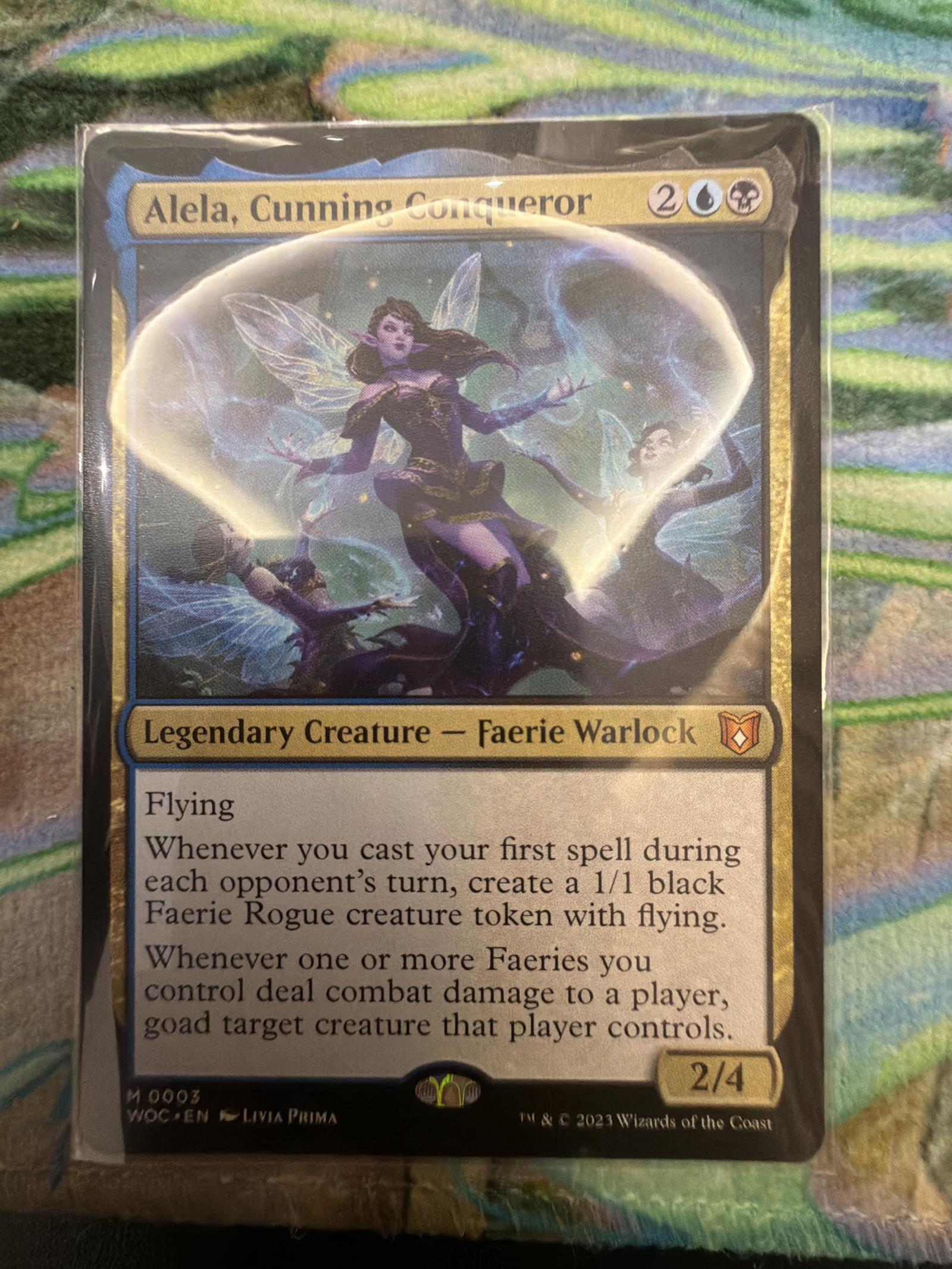 Alela, Cunning Conqueror from the WOC set, illustrated by Livia Prima. This card is a legendary Faerie Warlock creature with flying and abilities that create Faerie Rogue tokens and control combat damage effects. Playable in various Magic: The Gathering formats and highly collectible printing.