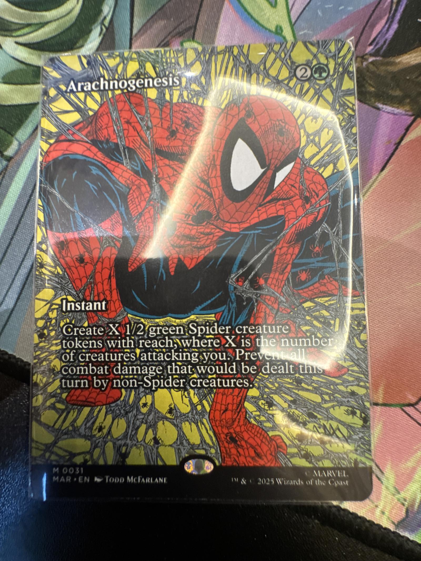Arachnogenesis from the Marvel Secret Lair set, illustrated by Todd McFarlane. This card is an instant that creates 1/2 green Spider creature tokens with reach, equal to the number of creatures attacking you, and prevents combat damage by non-Spider creatures this turn. The card is playable in various Spider tribal decks. The card text is in English.