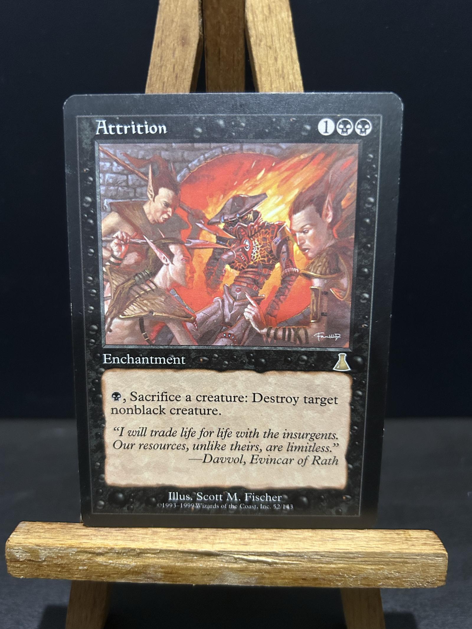 Attrition from the Tempest set, illustrated by Scott M. Fischer. This is a black enchantment card that allows sacrificing a creature to destroy a target nonblack creature. It is a normal printing, playable in certain black control or sacrifice-based decks in Magic: The Gathering. Card number 52 of 143 from Tempest.