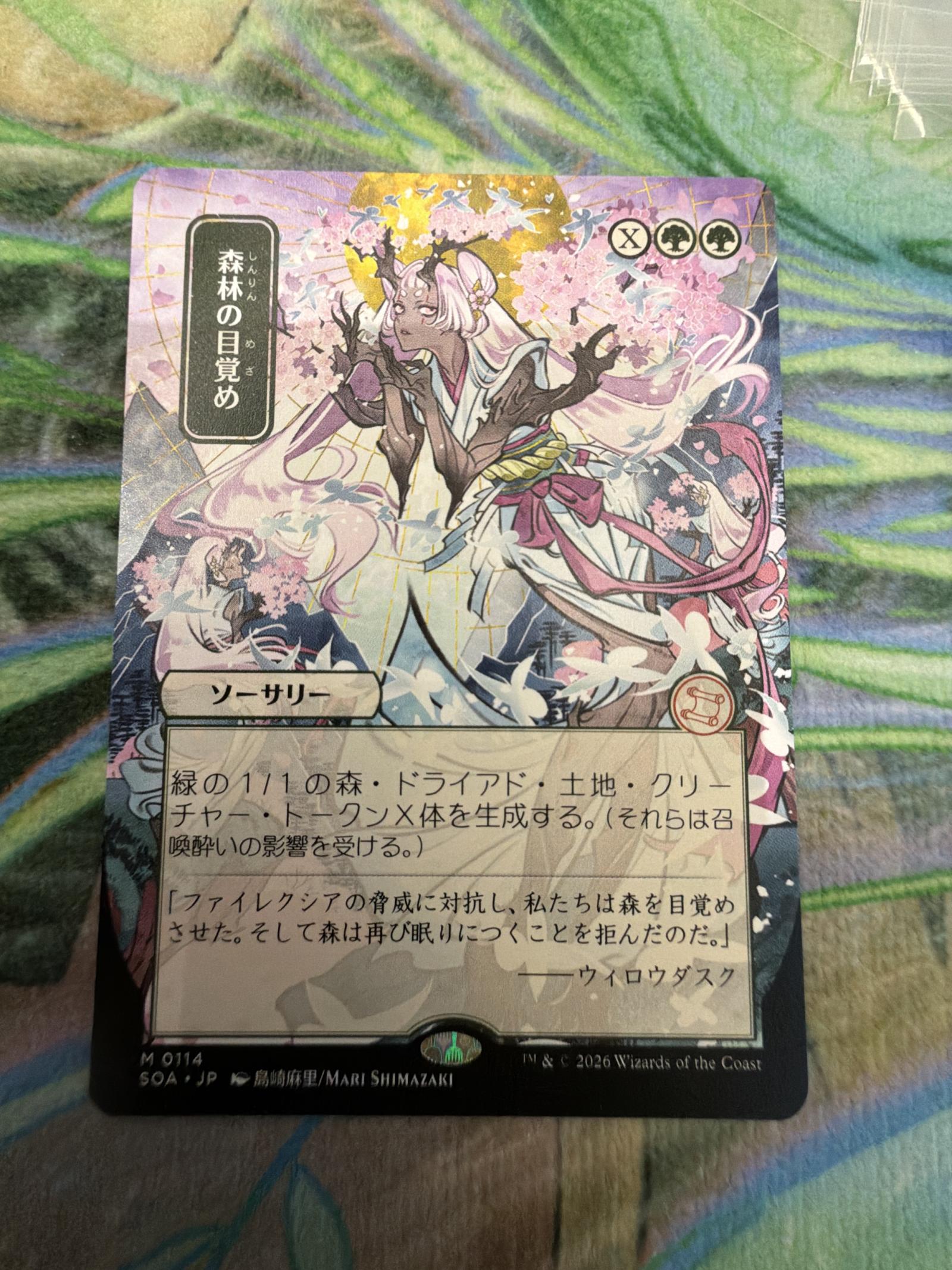 Awakening of the Forest Dryad, illustrated by Mari Shimazaki, from the set (SOA). This is a Japanese language non foil sorcery card. It generates green 1/1 Forest Dryad token creatures and is playable in certain formats. The card number is 114. The treatment adds a collectible value to the card.