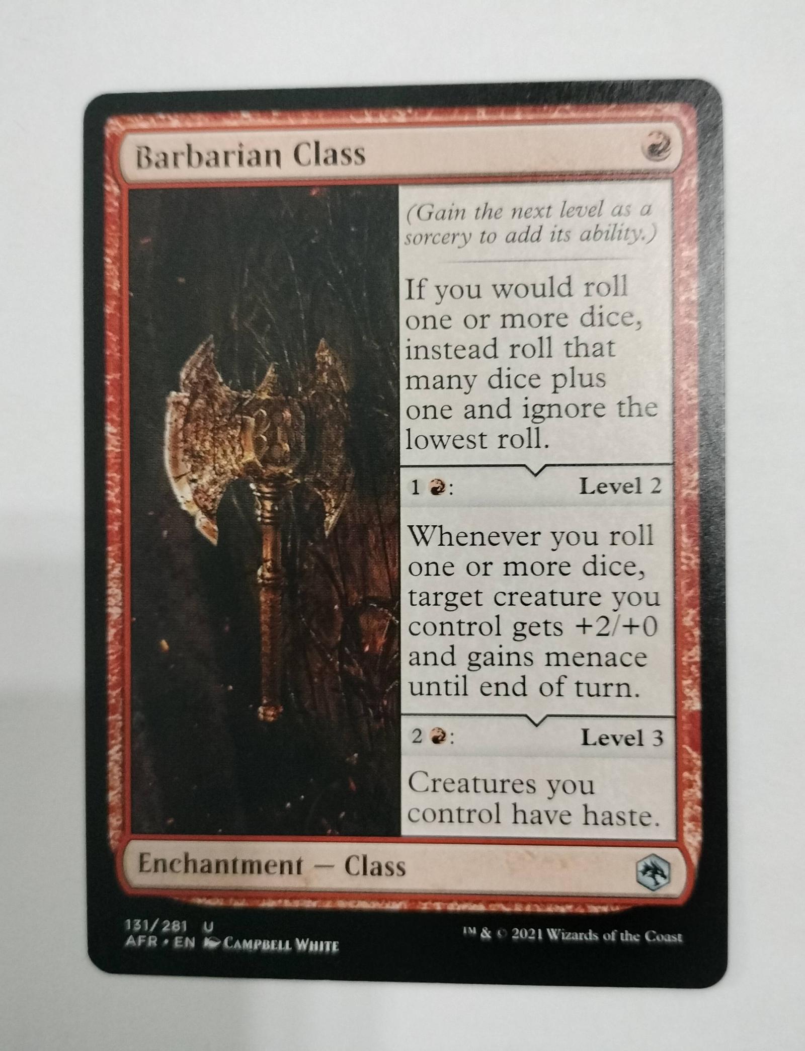 Barbarian Class from the Adventures in the Forgotten Realms set, illustrated by Campbell White. It is an enchantment class card that enhances dice rolling mechanics and grants abilities to your creatures. The card is playable in various formats and is appreciated both for its utility in gameplay and its thematic design.