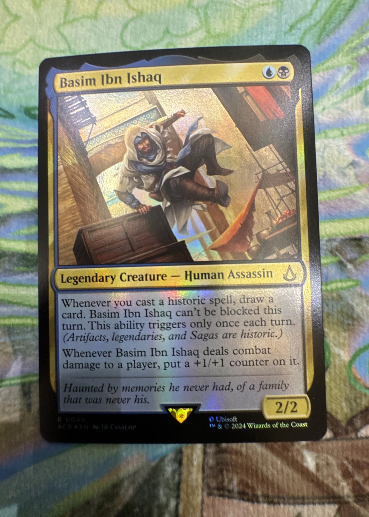Basim Ibn Ishaq is a Legendary Creature – Human Assassin from the Magic: The Gathering x Assassin's Creed Universes Beyond crossover set. The card is illustrated by JB Casacop and features a foil finish. Functionally, Basim is a historic-matters card with unblockability on trigger and self-growing potential, making it appealing for both meta play in Commander and collectibility due to its unique crossover nature. This card comes from the Universes Beyond: Assassin's Creed set and has a beautiful foil treatment for added value.