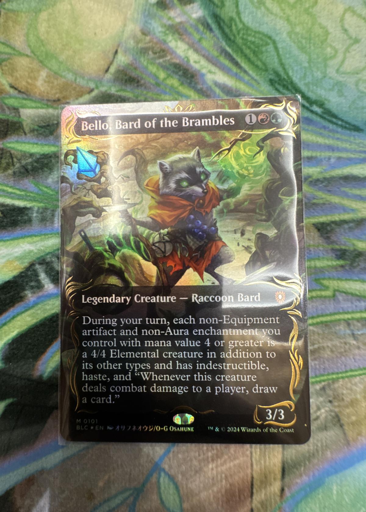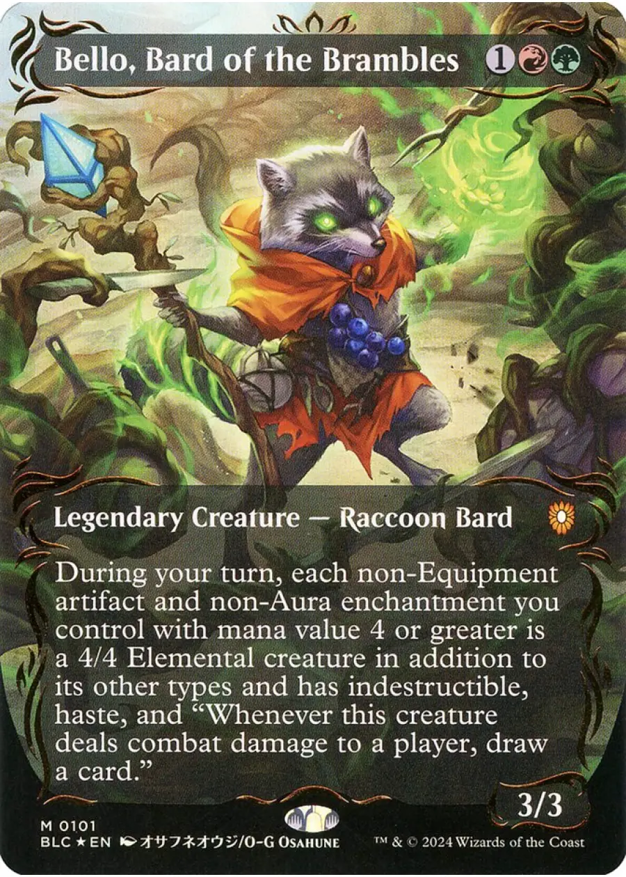 Bello, Bard of the Brambles is a Magic: The Gathering card featuring a Legendary Creature - Raccoon Bard. Illustrated by Osahune, it has a unique ability that transforms non-equipment artifacts and non-aura enchantments you control, with mana value 4 or greater, into a 4/4 Elemental creature. This card is part of the 2024 Wizards of the Coast collection. The card is foil, enhancing its collectability.