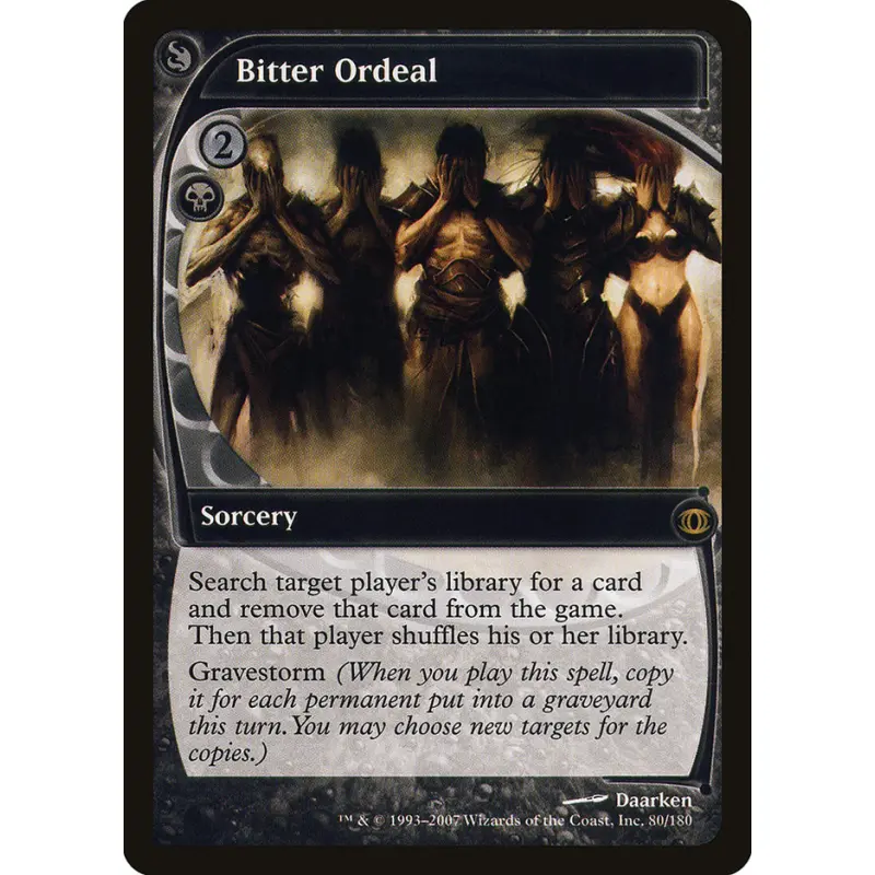 Bitter Ordeal from the Future Sight set, illustrated by Daarken. This is a sorcery card featuring Gravestorm and allows you to remove a card from a target player's library. It is a collectible card playable in certain decks. Card number 80/180.