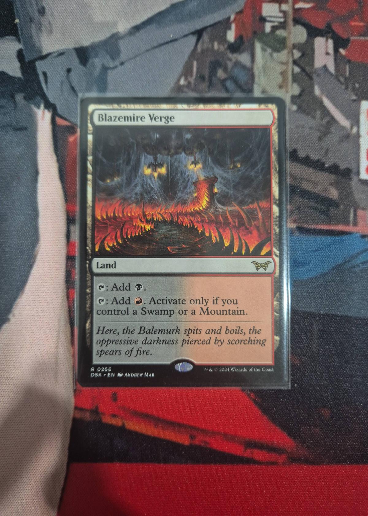Blazemire Verge is a rare land card from Magic: The Gathering®, featured in the 'Duskmourn: House of Horror' set (DSK). The card's artwork is by Andrew Mar. This is a normal (non-foil) English printing, with collector number 256. While not a major staple in top-tier competitive decks yet, its unique mana-fixing ability may appeal to both players looking for synergistic land bases and collectors of the horror-themed Duskmourn set. A great addition to any collection, especially for fans of atmospheric art.