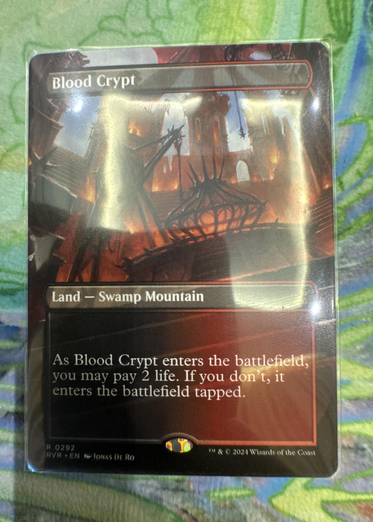 Blood Crypt is a staple land card (Swamp Mountain) from the Magic: The Gathering 'Ravnica Remastered' set, illustrated by Jonas De Ro. This card allows flexibility in mana fixing and is highly playable across multiple formats due to its ability to enter the battlefield untapped for a minor life payment. This version is the normal (non-foil) printing. A must-have for competitive decks and collectors alike. Set: Ravnica Remastered (RVR), 2024.
