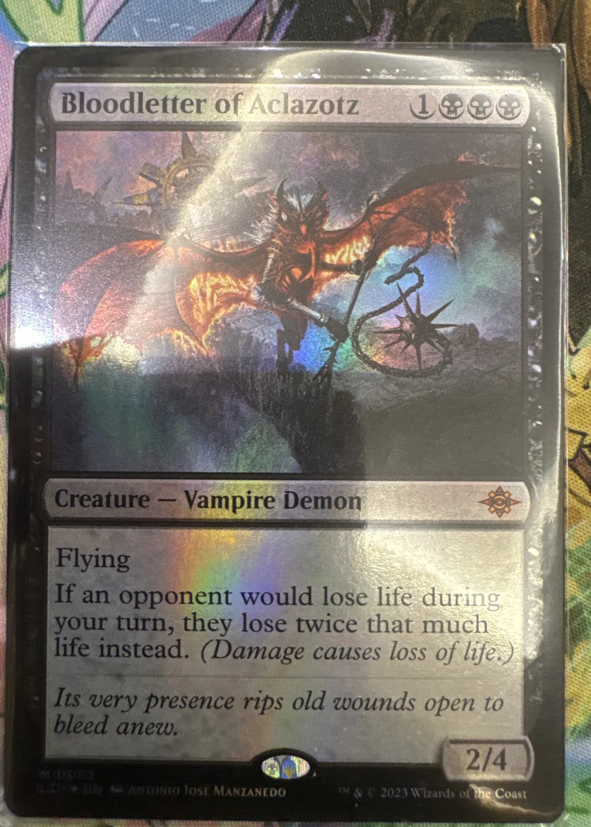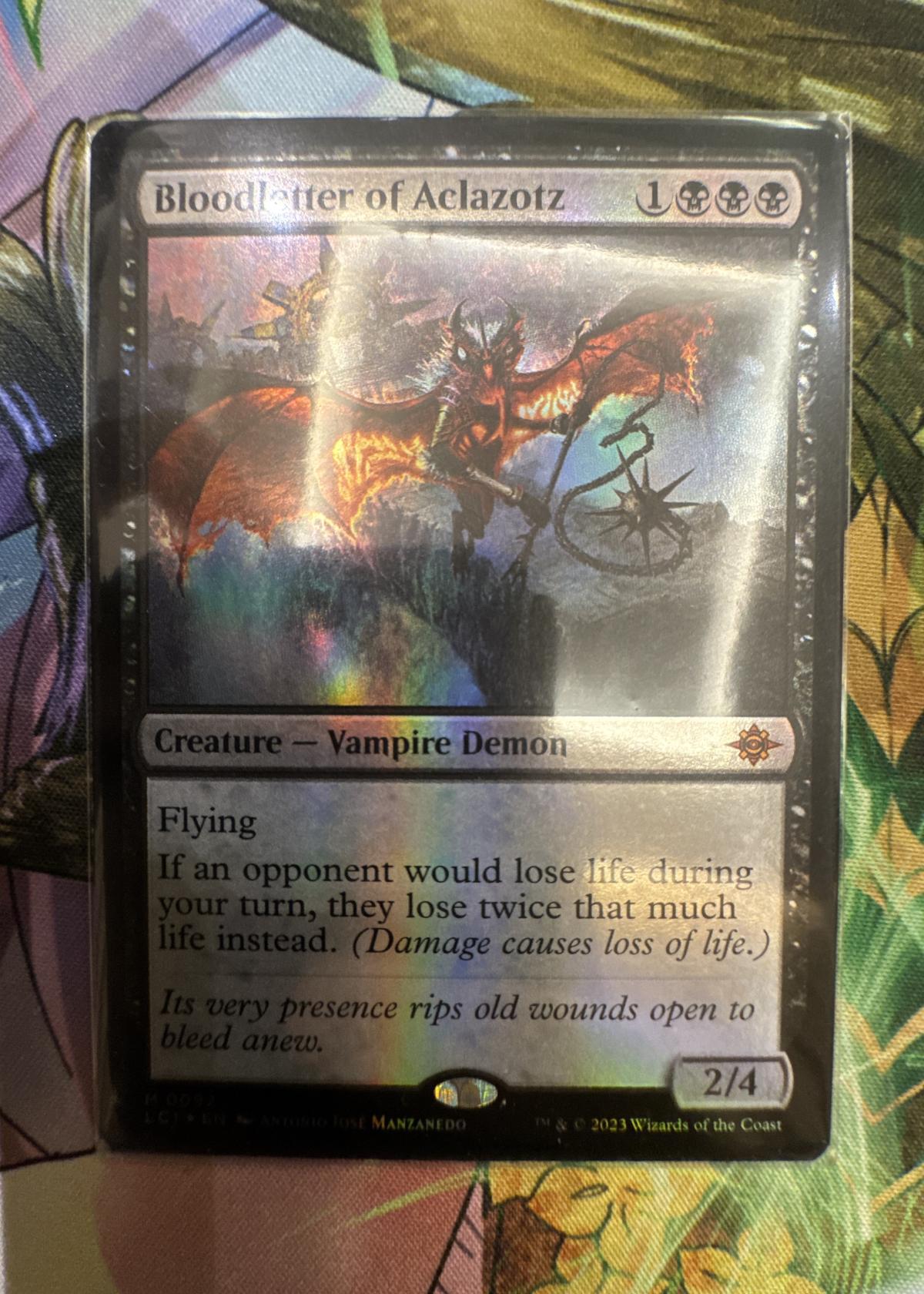 Bloodletter of Aclazotz is a rare Magic: The Gathering card from the Lost Caverns of Ixalan set, illustrated by Antonio José Manzanedo. This is a foil printing, as seen from the rainbow reflection on the card. It is numbered 97 in the set (LCI - English). The card's effect makes it a strong card in certain meta decks, especially those focusing on life-loss strategies in Commander and other formats. The card is both collectible and playable and features striking vampire demon artwork.