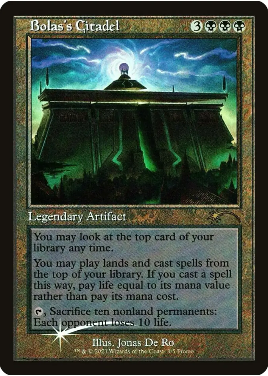 Bolas's Citadel is a legendary artifact card illustrated by Jonas De Ro. This is a special foil promo printing (Promo Pack set: PPR). It allows you to play lands and cast spells from the top of your library, paying life instead of mana, and features a powerful ability for multiplayer formats. This card is highly playable in Commander and casual formats, making it both a collectible and a meta-relevant card for Magic the Gathering.
