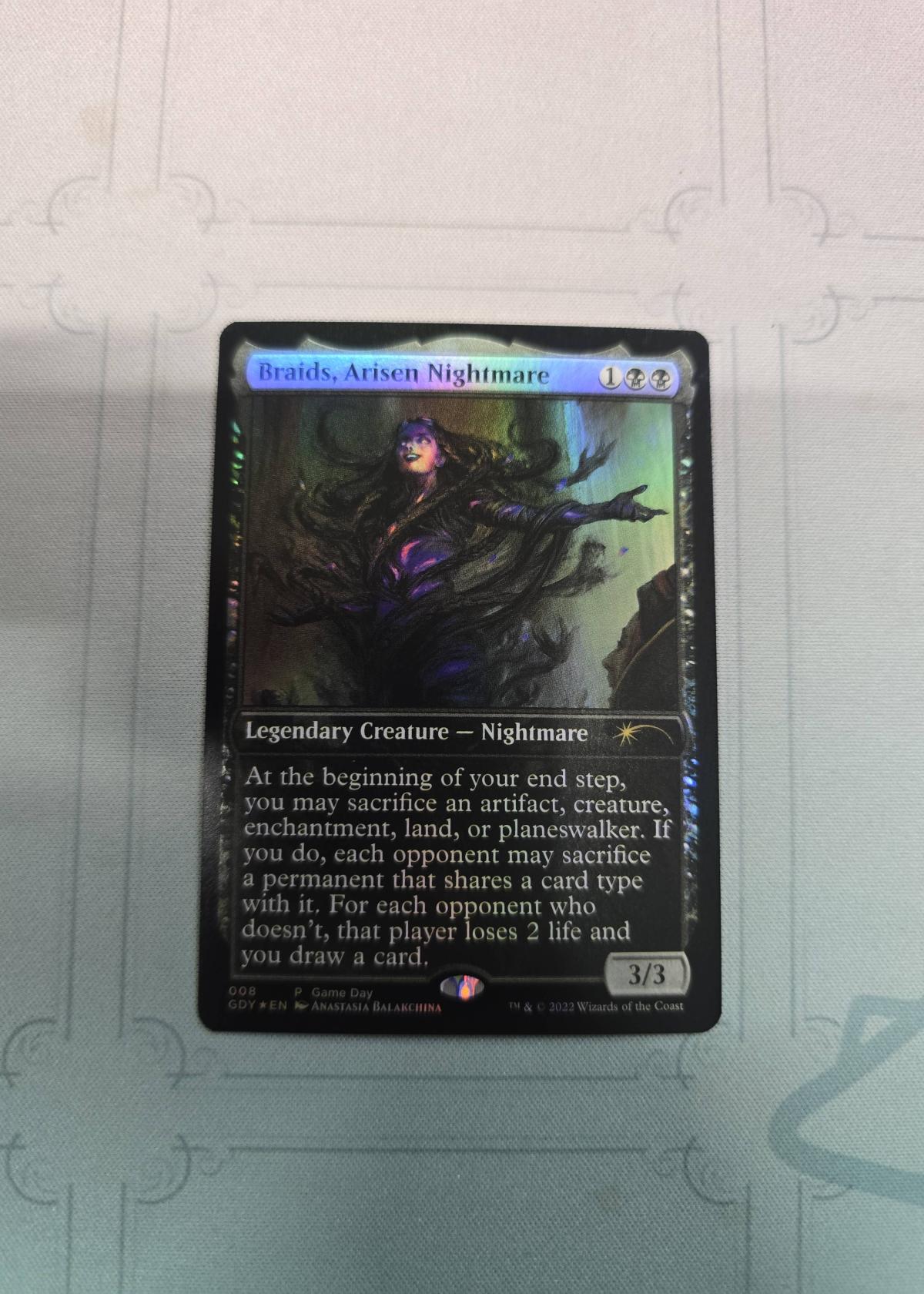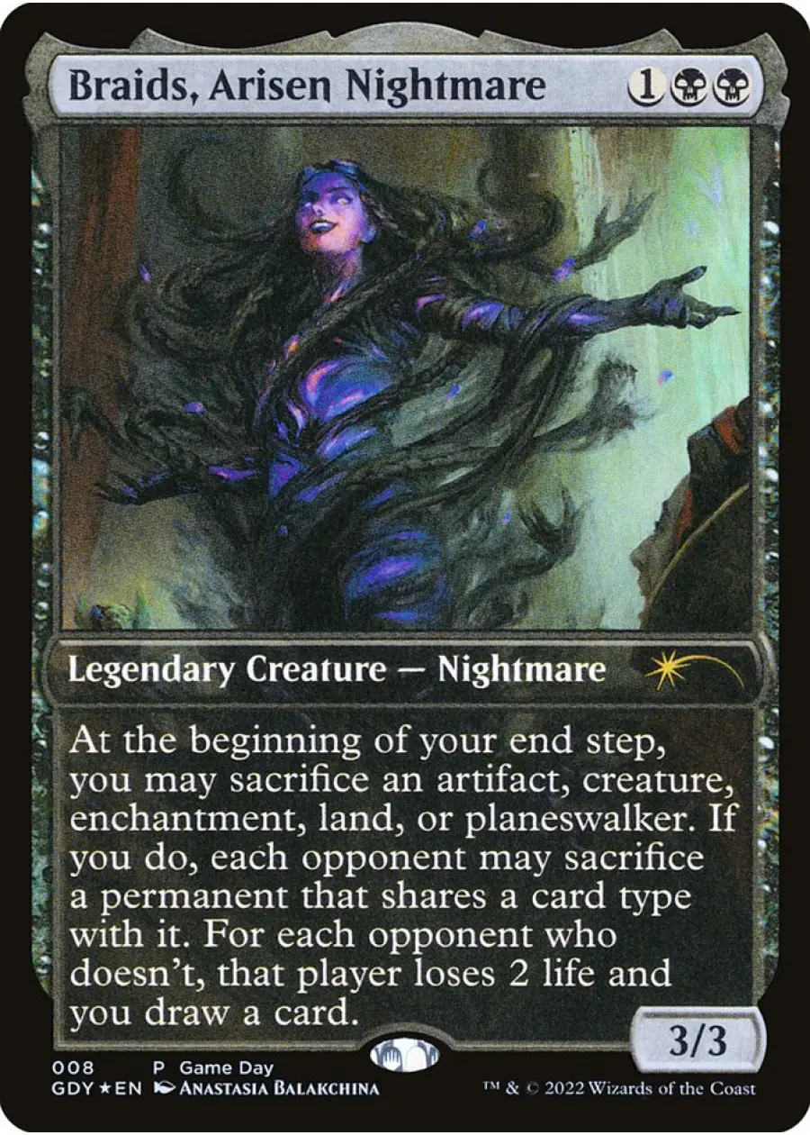 This is a foil Game Day promo of 'Braids, Arisen Nightmare' from Magic: The Gathering, illustrated by Anastasia Balakchina. The card is from the Game Day promo set (code GDY), with collector number 8. Braids, Arisen Nightmare is a legendary creature – Nightmare and is playable in Standard and Commander formats, often used for its powerful card draw and sacrifice synergy. Being a Game Day promo, this version is collectible and features unique promo foil treatment.