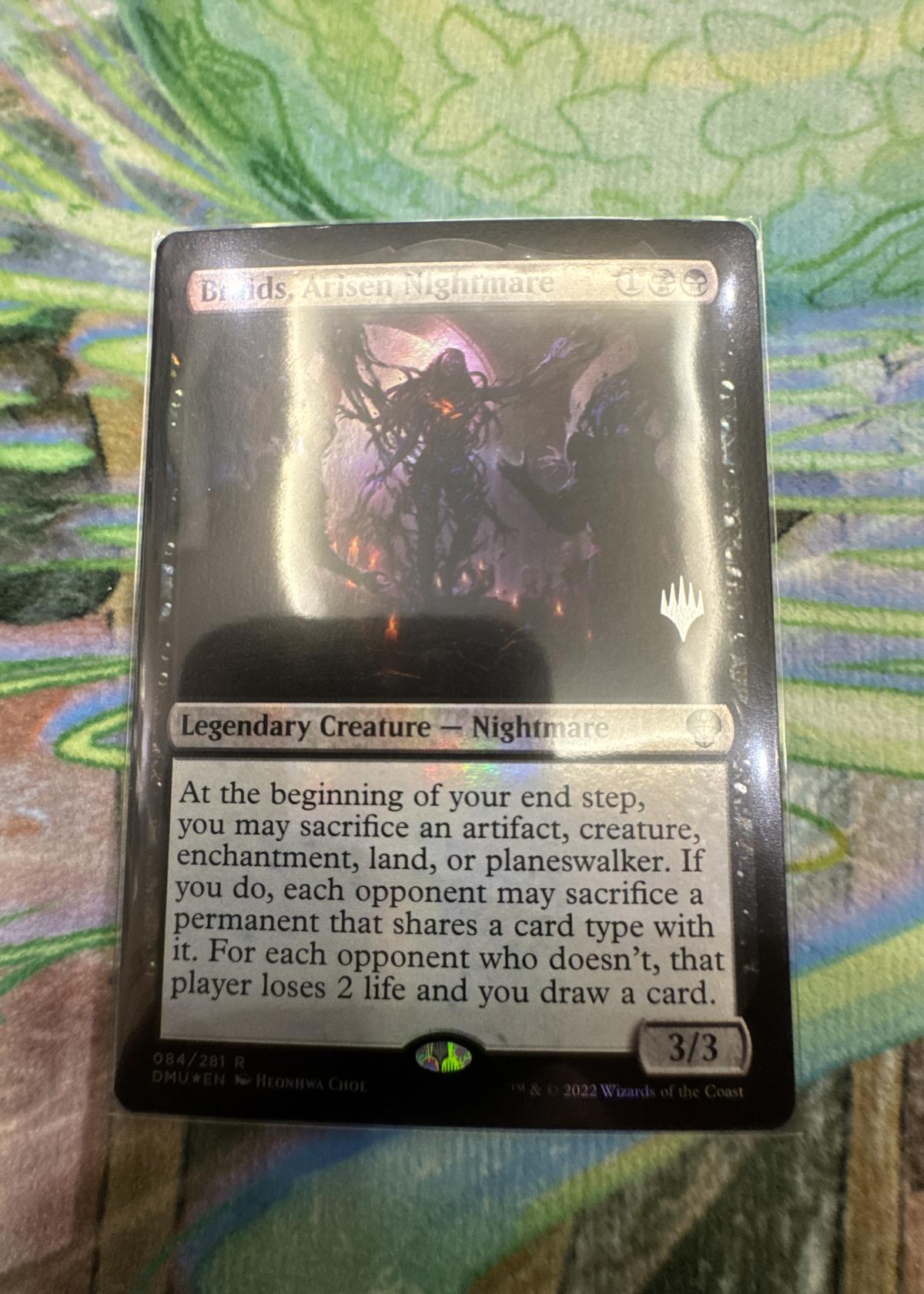 Braids, Arisen Nightmare is a Legendary Creature card (Nightmare) from the Dominaria United set of Magic: The Gathering, illustrated by Heonhwa Choe. This is a foil printing, as indicated by the holographic shine. The card is number 84 out of 281 in the DMU set. Braids is primarily of interest for its powerful multiplayer EDH (Commander) ability, allowing you to gain card advantage and pressure opponents' life totals. Artist: Heonhwa Choe. Set: Dominaria United. This card is highly playable in Commander format and can also be a sought-after collectible, especially in foil treatment.