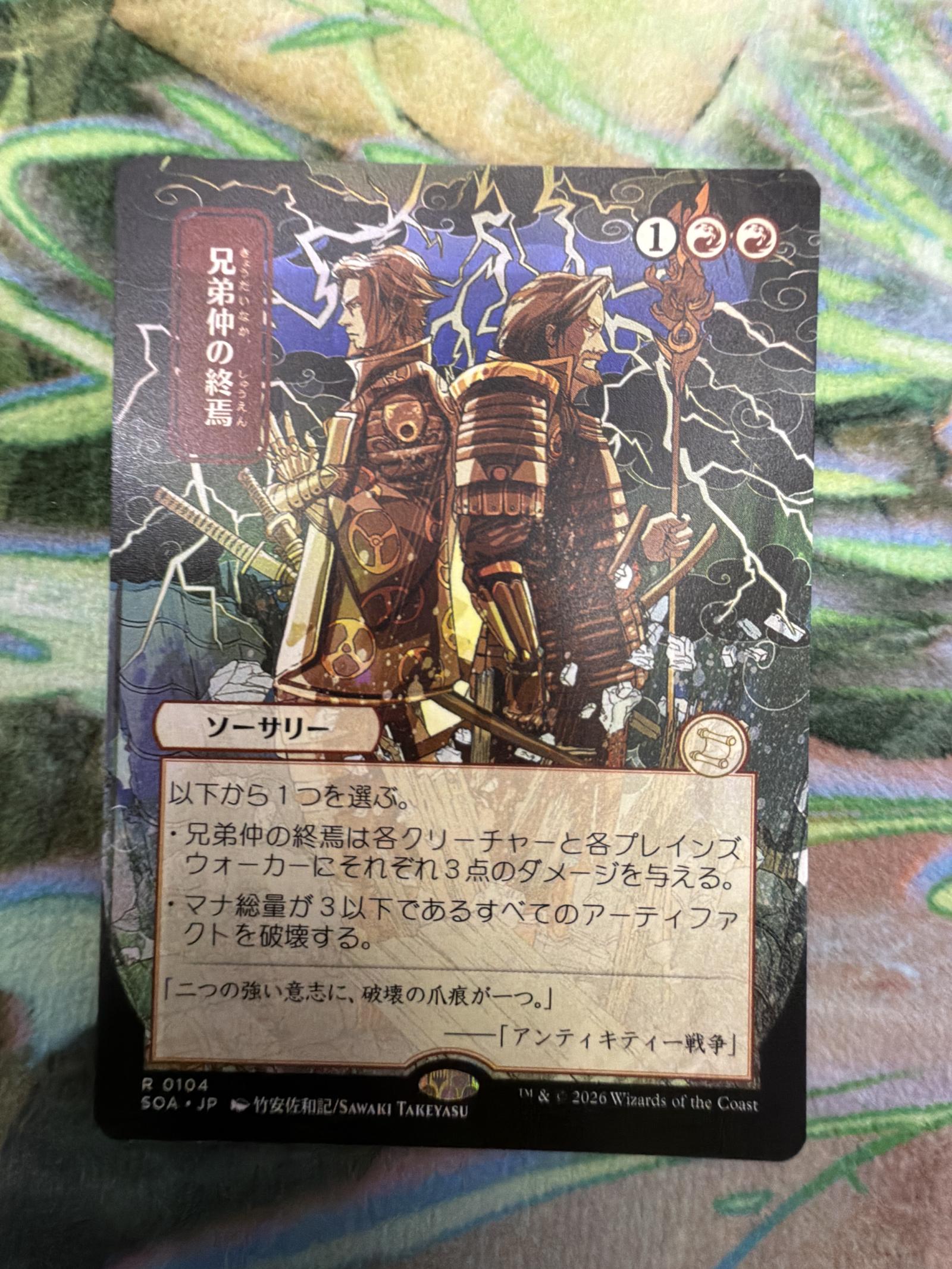 This is a Japanese Magic: The Gathering card titled 'Brotherhood Termination' from the Secret Lair: Outsiders (SOA) set. It is a rare (R) sorcery card illustrated by Sawaki Takeyasu, released in 2026. The card features unique artwork and is playable in the game. The text and details confirm it is not foil but a normal printing.