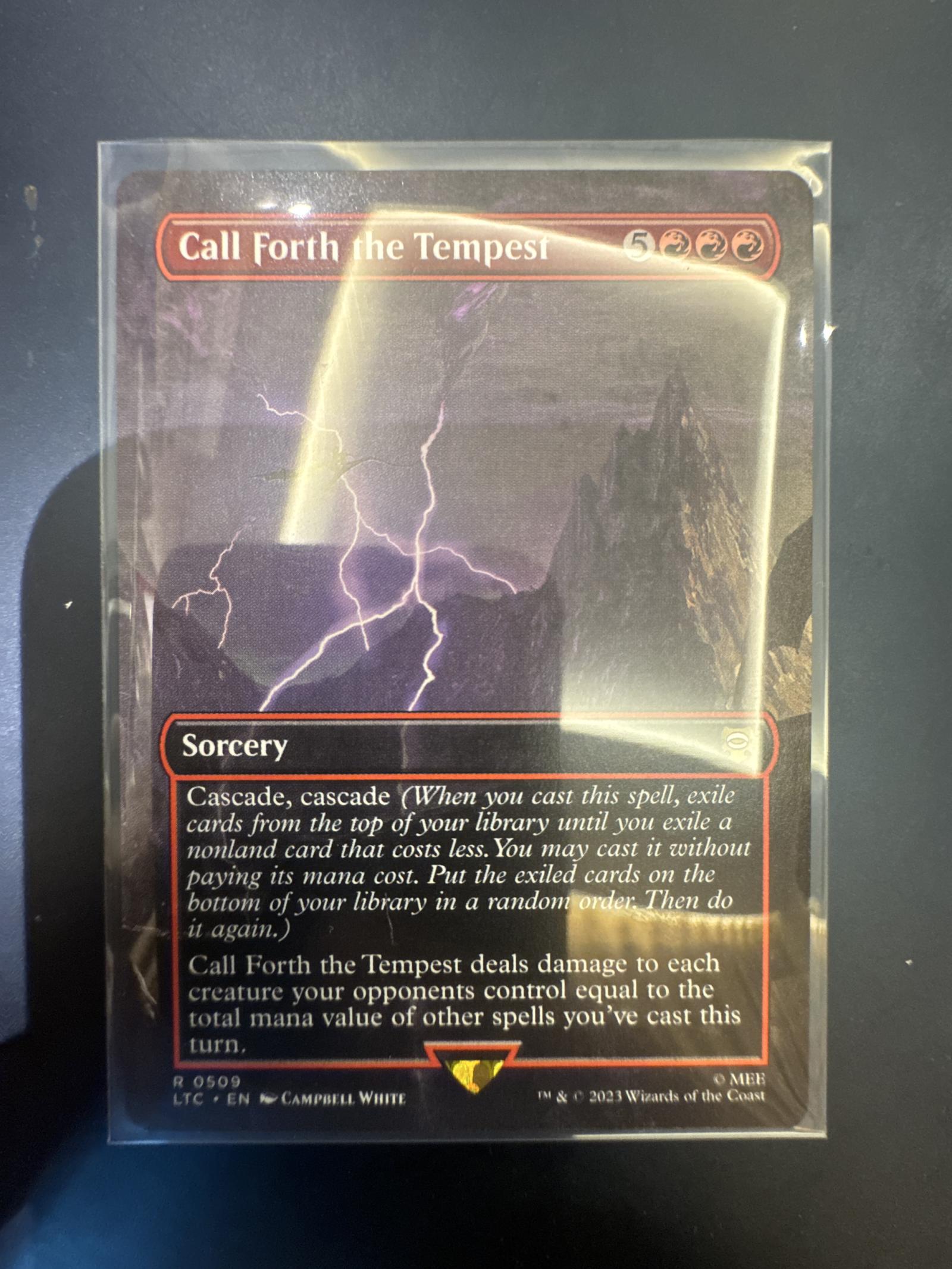 Call Forth the Tempest is a sorcery card from the MEB set released in 2023. Illustrated by Campbell White. This card features cascade twice and deals damage to each creature your opponents control equal to the total mana value of other spells cast this turn. The card is in English and appears to have a normal printing treatment. It is playable in the meta due to its cascade ability and impactful board effect.