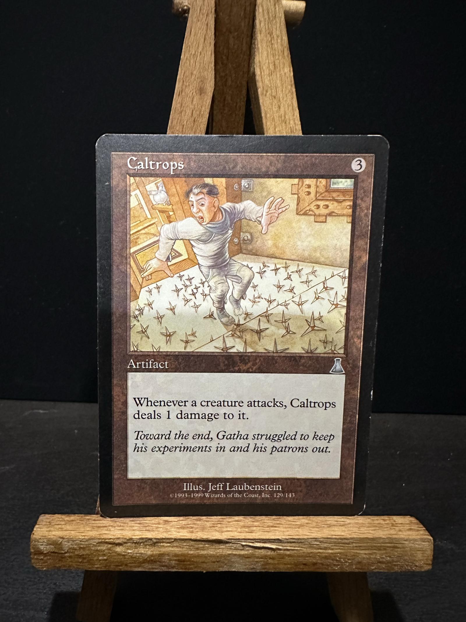 Caltrops is an Artifact card from the Alpha set of Magic: The Gathering, illustrated by Jeff Laubenstein. This card deals 1 damage to creatures when they attack and is considered playable in certain formats. This particular card is non-foil and in English.