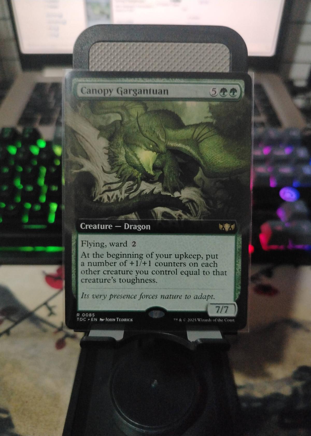 Canopy Gargantuan is a green Creature — Dragon card illustrated by John Tedrick. This card is from a 2023 Magic: The Gathering set (set code TDC). The card features flying, ward 2, and an ability that places +1/+1 counters on your creatures based on their toughness at the beginning of your upkeep. It is marked as rare (R). This card is in English and has normal (non-foil) treatment. Canopy Gargantuan is likely more collectible than playable in competitive formats due to its high mana cost and unique counter ability, but could find niche use in casual or Commander decks focused on counters. No grade or slab information is available.