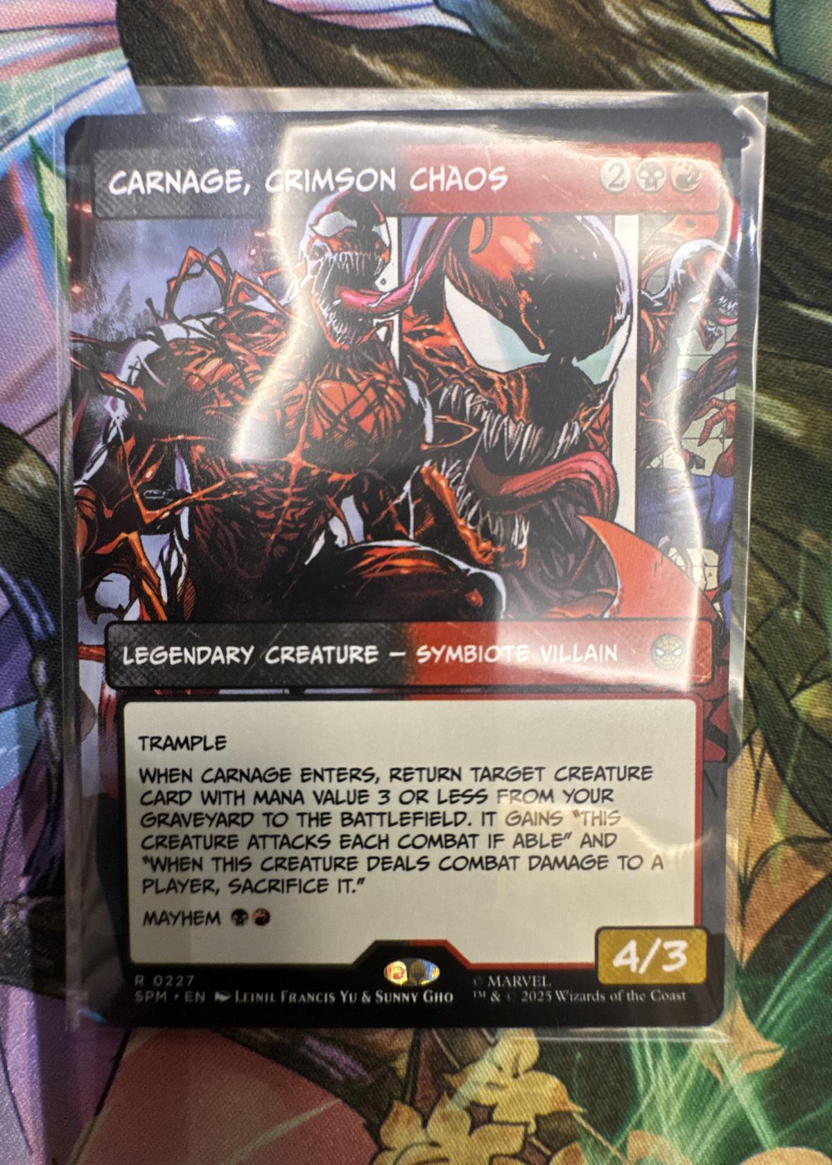 Carnage, Crimson Chaos is a Legendary Creature from the Magic: The Gathering Marvel crossover set, featuring artwork by Leinil Francis Yu & Sunny Gho. This card has the SPM set code and English language (EN), with collector number 227. The card depicts the infamous symbiote villain Carnage. It is a rare card and does not appear to be foil. This card is likely more collectible due to its unique Marvel crossover status than competitively playable in standard Magic metas.