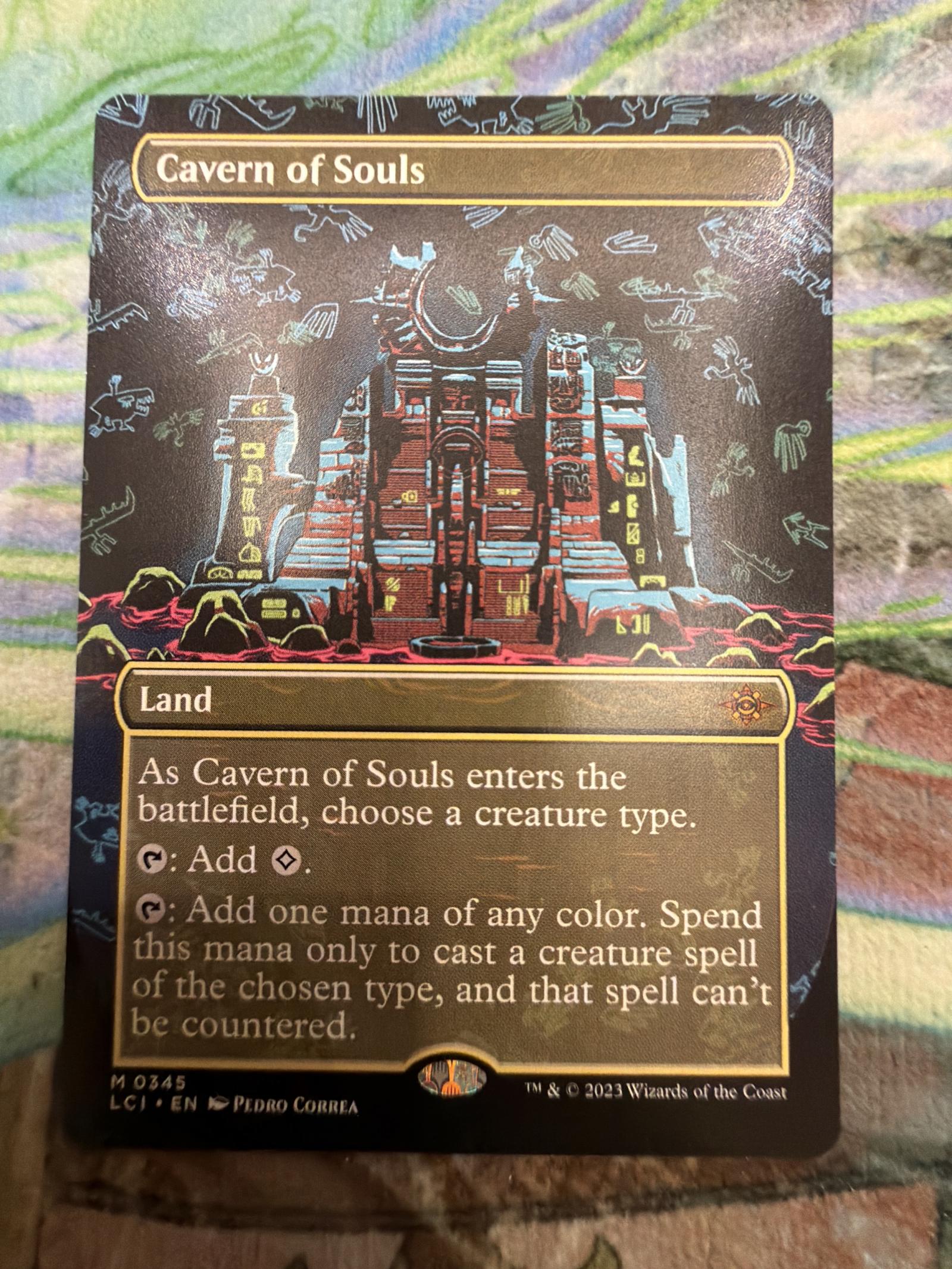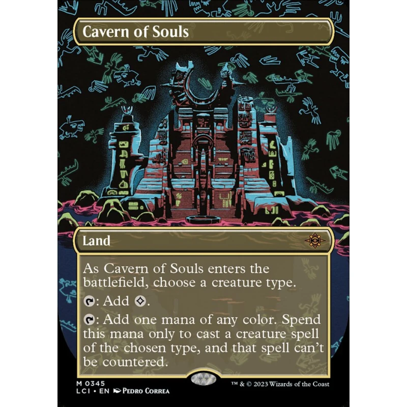 Cavern of Souls is a playable land card from the Magic Legends Clash set (2023). This NON FOIL card features art by Pedro Correa and allows you to choose a creature type as it enters the battlefield. It produces colorless mana or mana of any color to cast creature spells of the chosen type, which can't be countered. Highly sought after for tribal decks and collectors.