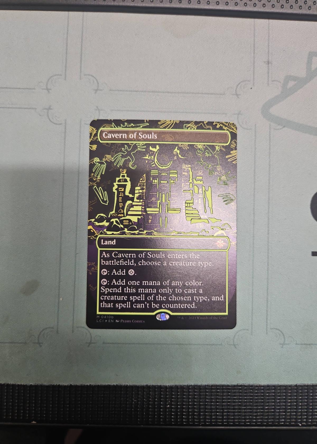 Cavern of Souls from The Lost Caverns of Ixalan (LCI) set, card number M410b. Showcasing stunning neon ink foil treatment and illustrated by Pedro Correa. This premium version is highly collectible. Cavern of Souls is a top-tier playable land in many competitive Magic: The Gathering formats due to its ability to make creature spells uncounterable. Language: English. Condition and grade not specified.