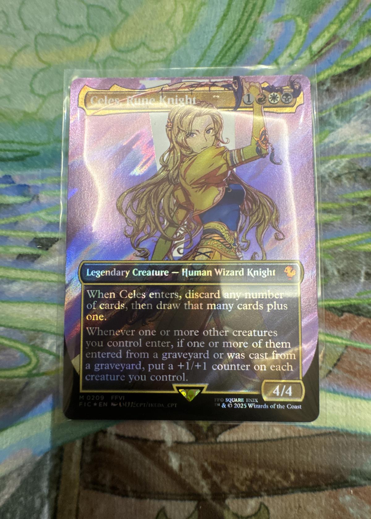 Celes, Rune Knight is a Legendary Creature — Human Wizard Knight from the Final Fantasy VI (FFVI) Secret Lair drop for Magic: The Gathering. This version is printed with a foil treatment and features exclusive artwork from the collaboration set between Magic: The Gathering and Square Enix. The card is playable in commander and casual formats, but is mainly a collectible due to the crossover nature. The card's ability focuses on card draw and graveyard interactions, making it appealing for specific strategies. Artist information is not provided on the visible side. Set: Final Fantasy VI Secret Lair, Foil.