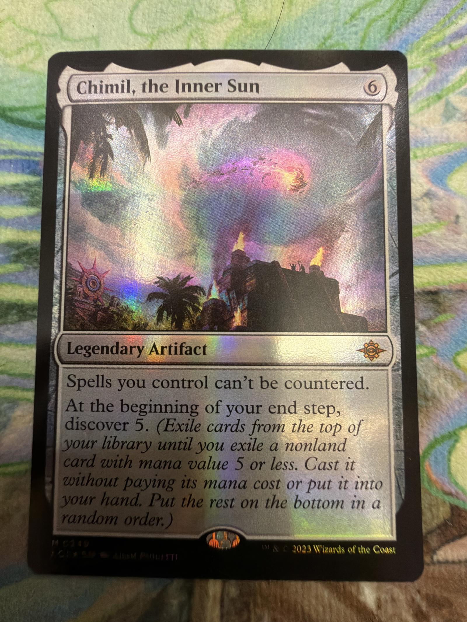 Chimil, the Inner Sun is a Legendary Artifact from the Magic The Gathering (LCI), illustrated by Alasdair Pinckert. This foil card features spells you control that can’t be countered and a unique Discover 5 ability. It is playable in various Magic formats and sought after for its powerful effect and foil treatment.