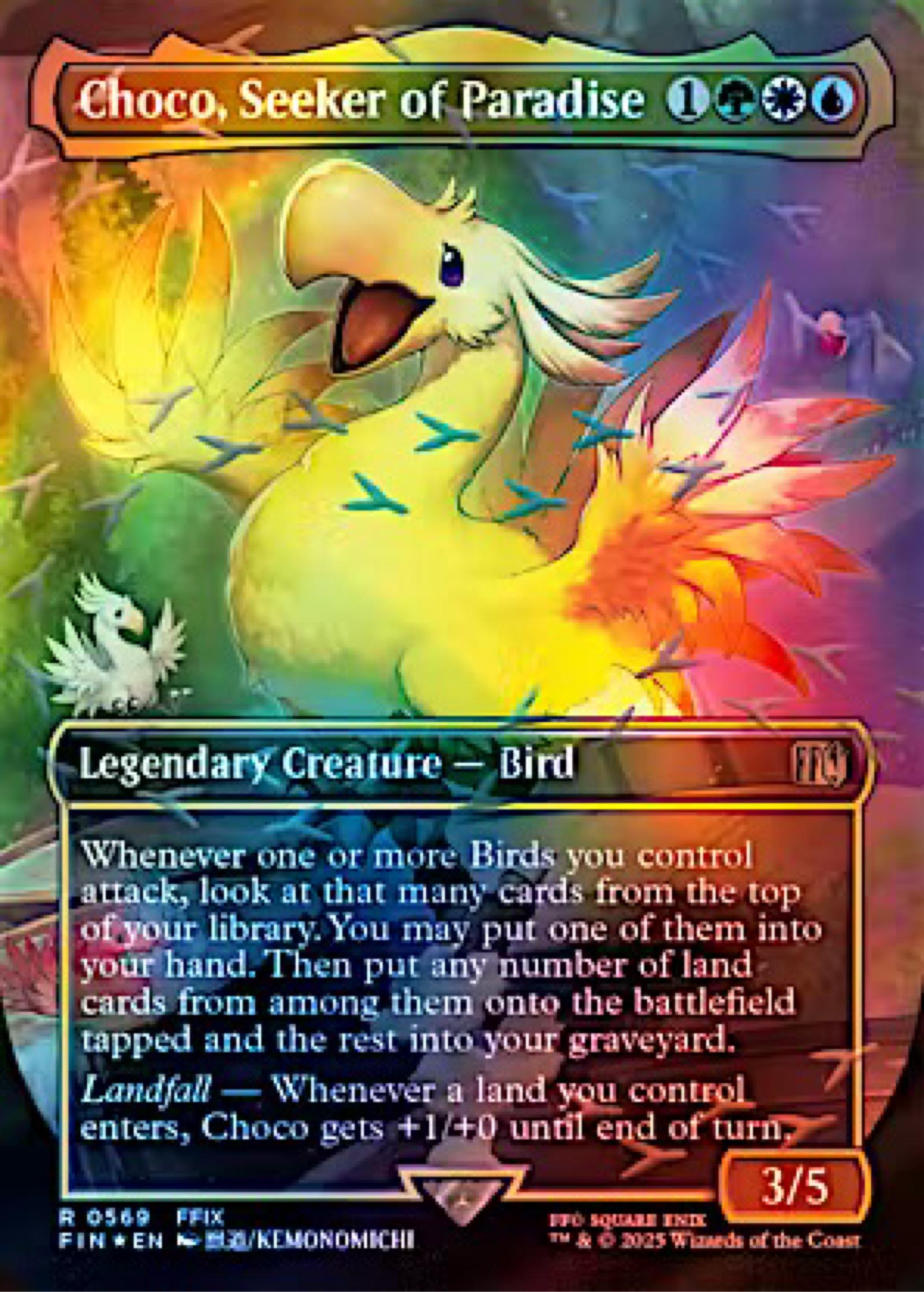 Edition: Final Fantasy Variants Type: Legendary Creature - Bird Cast: 1 G W U Rarity: R Collector #: 0569 Pow/Tuf: 3/5 Whenever one or more Birds you control attack, look at that many cards from the top of your library. You may put one of them into your hand. Then put any number of land cards from among them onto the battlefield tapped and the rest into your graveyard. Landfall - Whenever a land you control enters, Choco gets +1/+0 until end of turn.