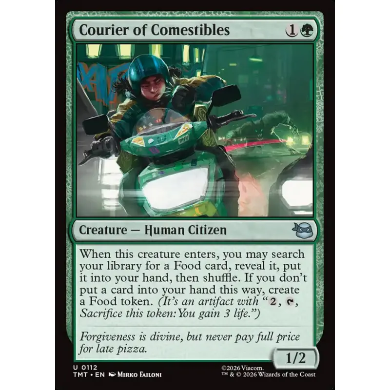 When this creature enters, you may search your library for a Food card, reveal it, put it into your hand, then shuffle. If you don't put a card into your hand this way, create a Food token. (It's an artifact with "
