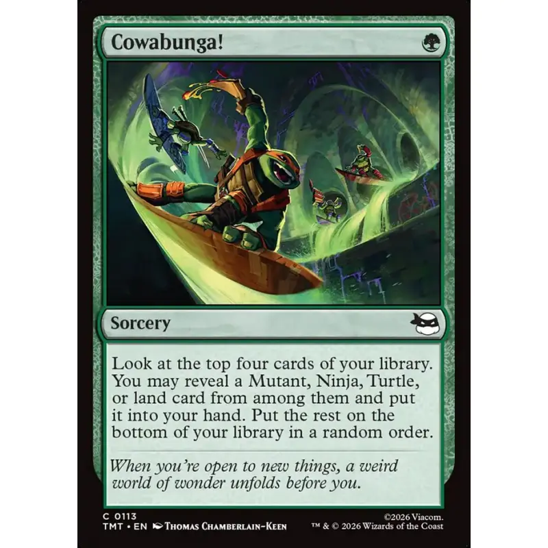 - Look at the top four cards of your library. You may reveal a Mutant, Ninja, Turtle, or land card from among them and put it into your hand. Put the rest on the bottom of your library in a random order.