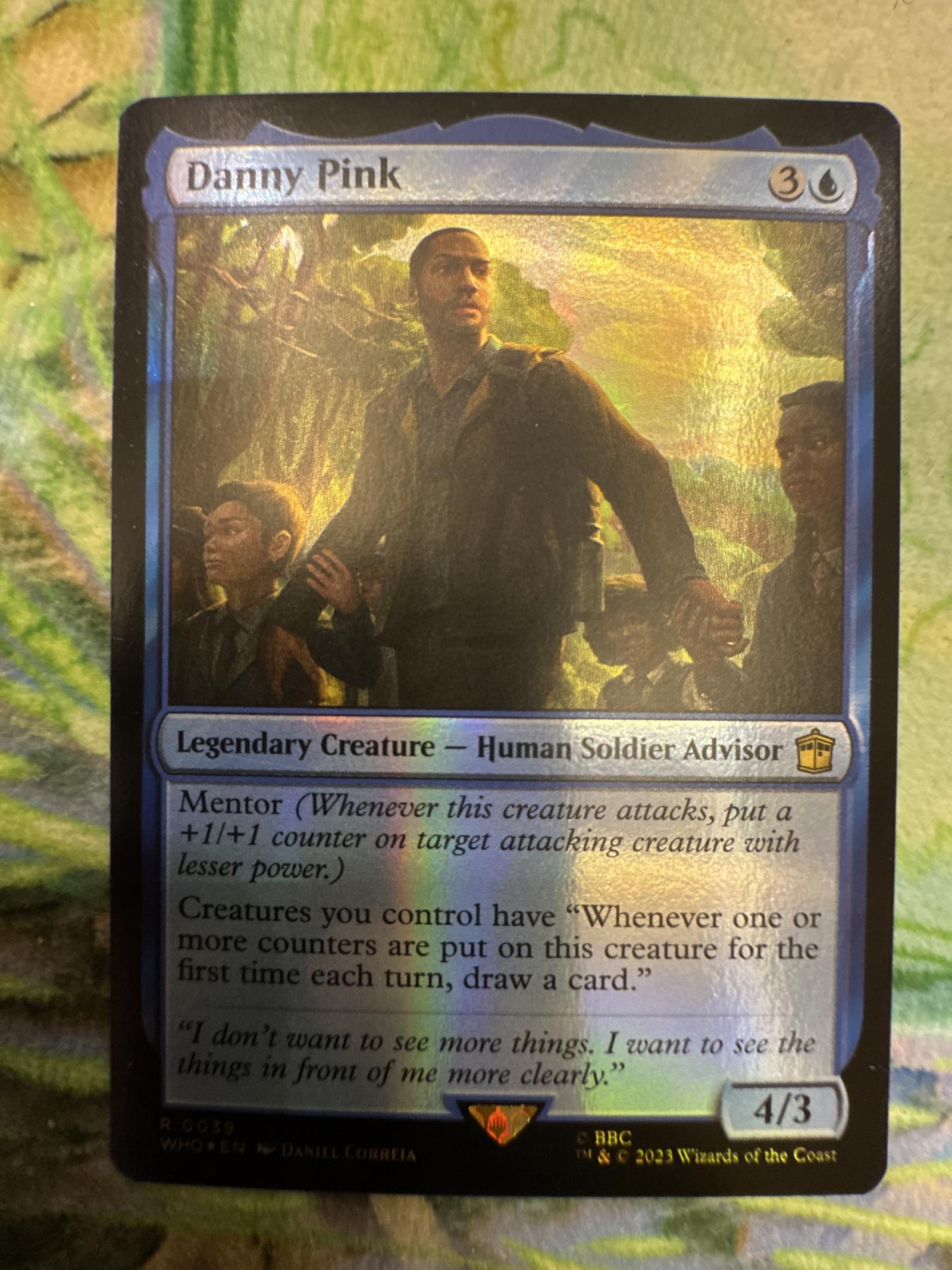 This is a foil Danny Pink card from the Magic: The Gathering set Doctor Who. The card is a legendary creature – Human Soldier Advisor, featuring the Mentor ability and a draw mechanic that fits well in certain blue aggressive or tempo decks. Illustrated by Daniel Correia. This card can be playable in some niche meta decks and also valuable as a collectible due to its foil treatment and Commander Deck origin.