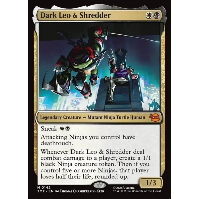 Whenever Dark Leo & Shredder deal combat damage to a player, create a 1/1 black Ninja creature token. Then if you control five or more Ninjas, that player loses half their life, rounded up.