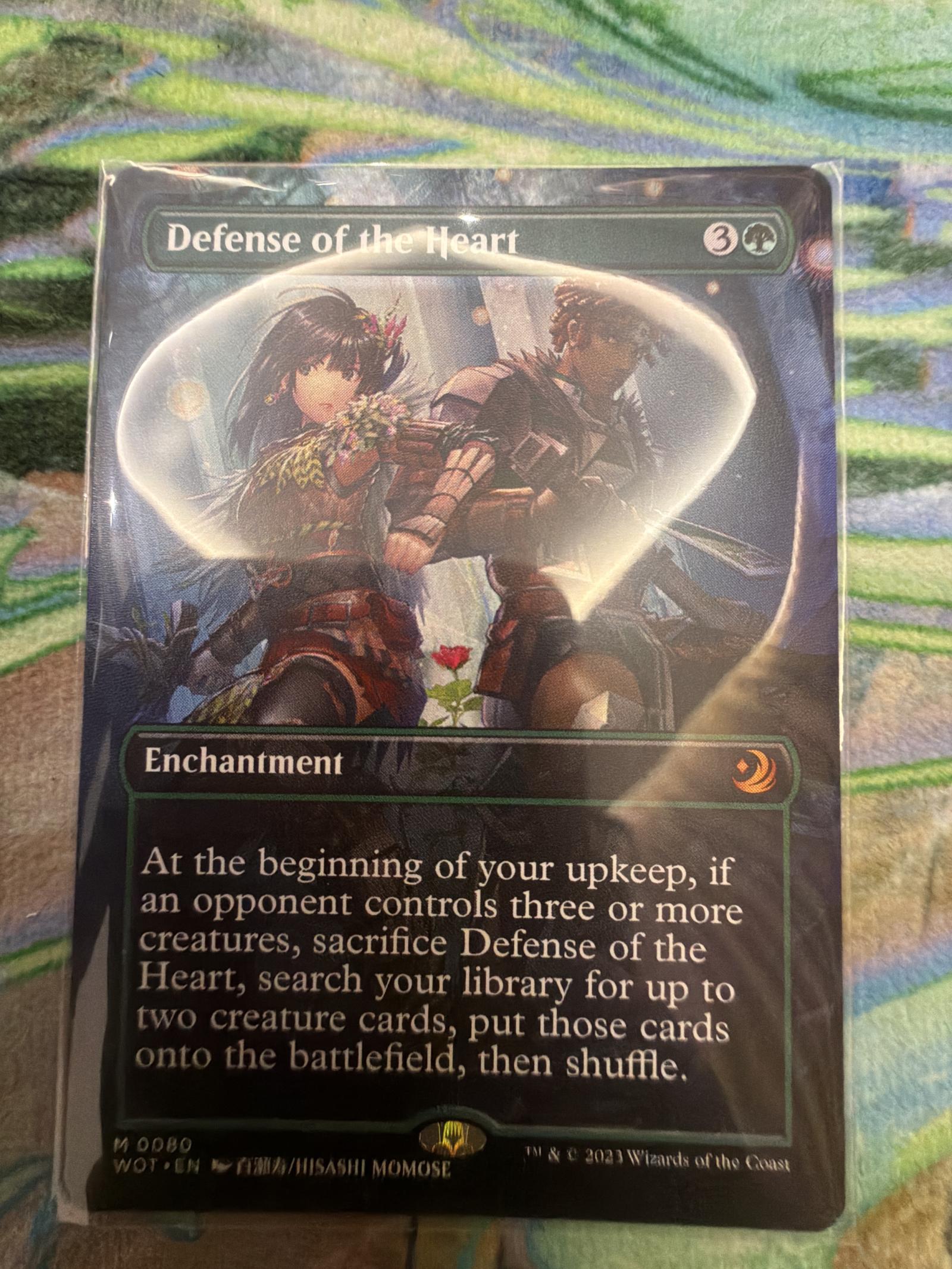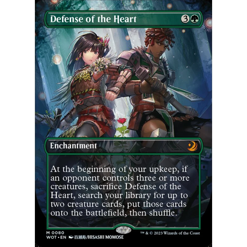 Defense of the Heart from War of the Spark (WOT) set, illustrated by Hisashi Momose. This enchantment card allows you to sacrifice it if an opponent controls three or more creatures to search your library for up to two creature cards and put them onto the battlefield. Playable in various green creature-based decks. Card number 80.