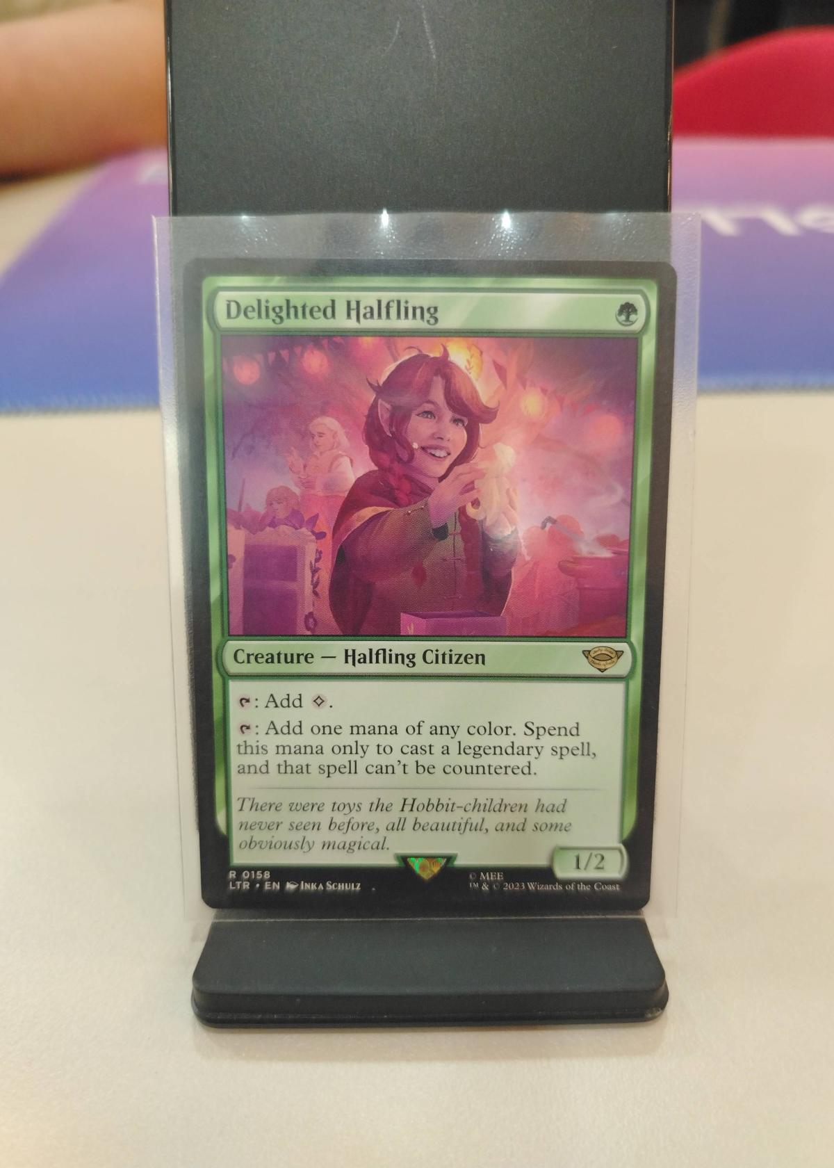 Delighted Halfling from The Lord of the Rings: Tales of Middle-earth set. Card number 158, illustrated by Inka Schulz. This card is printed in English with a normal (non-foil) treatment. Delighted Halfling is highly playable in Magic: The Gathering meta as a versatile mana creature, especially for decks focused on legendary spells. This is a sought-after card for both competitive play and collectors.