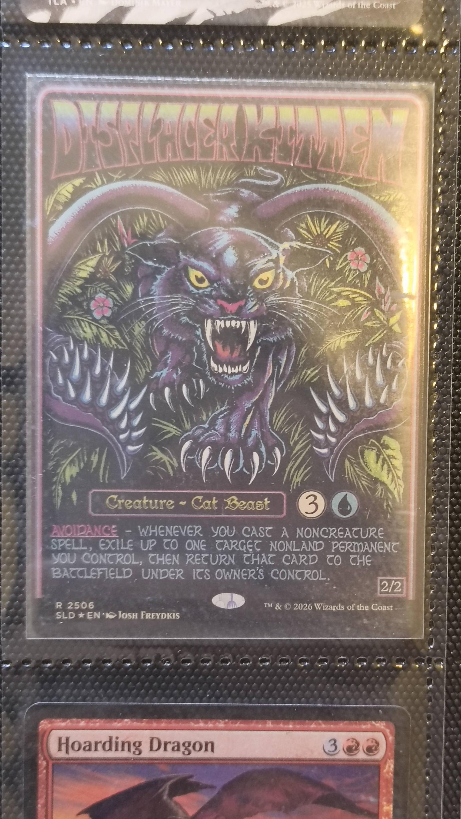 This is a Displacer Kitten card from Magic: The Gathering, featuring the Creature Cat Beast with unique abilities. The card is from the 2026 Wizards of the Coast edition and illustrated by Josh Freydkis. It is a collectible game card suitable for enthusiasts and players.
