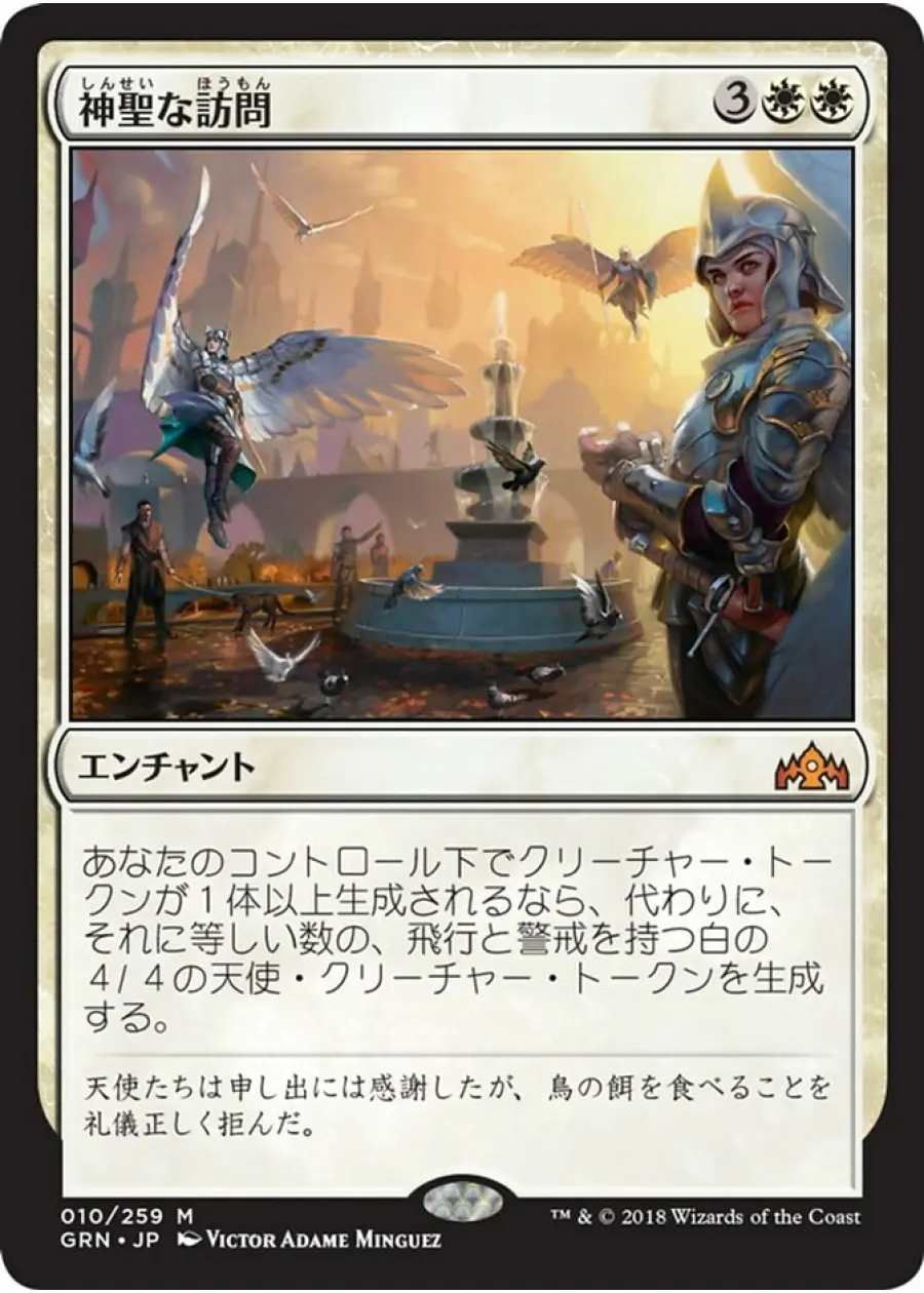 あなたのコントロール下でクリーチャー・トークンが1体以上生成されるなら、代わりに、それに等しい数の、飛行と警戒を持つ白の4/4の天使・クリーチャー・トークンを生成する。 - Flavor Text