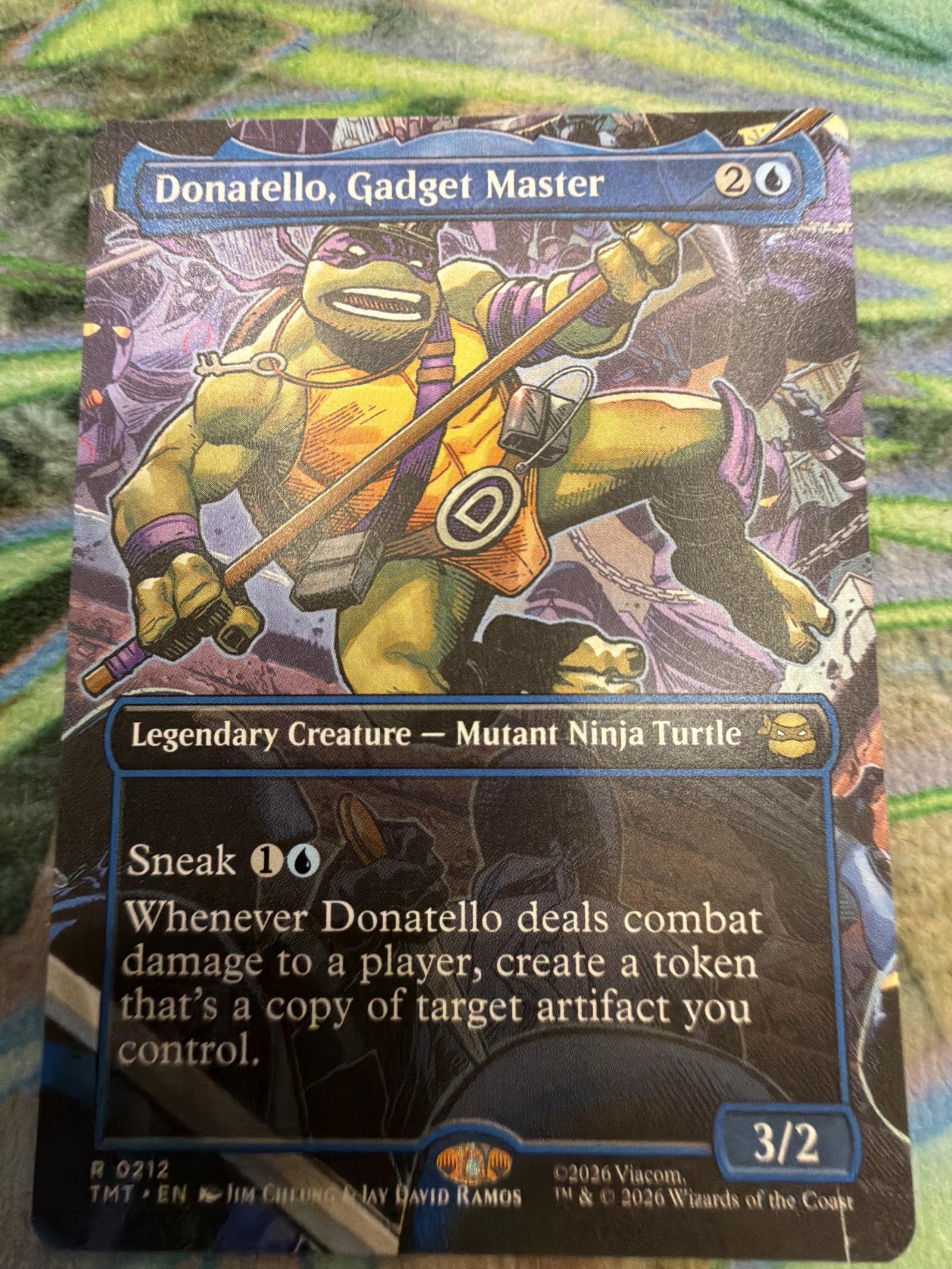 Donatello, Gadget Master is a Legendary Creature - Mutant Ninja Turtle card from the Magic: The Gathering set TMNT. The card features art by Jim Cheung and Jay David Ramos. This is a normal printing and has collector number 212. It is a collectible and potentially playable card that allows you to create tokens copying artifacts when Donatello deals combat damage to a player.