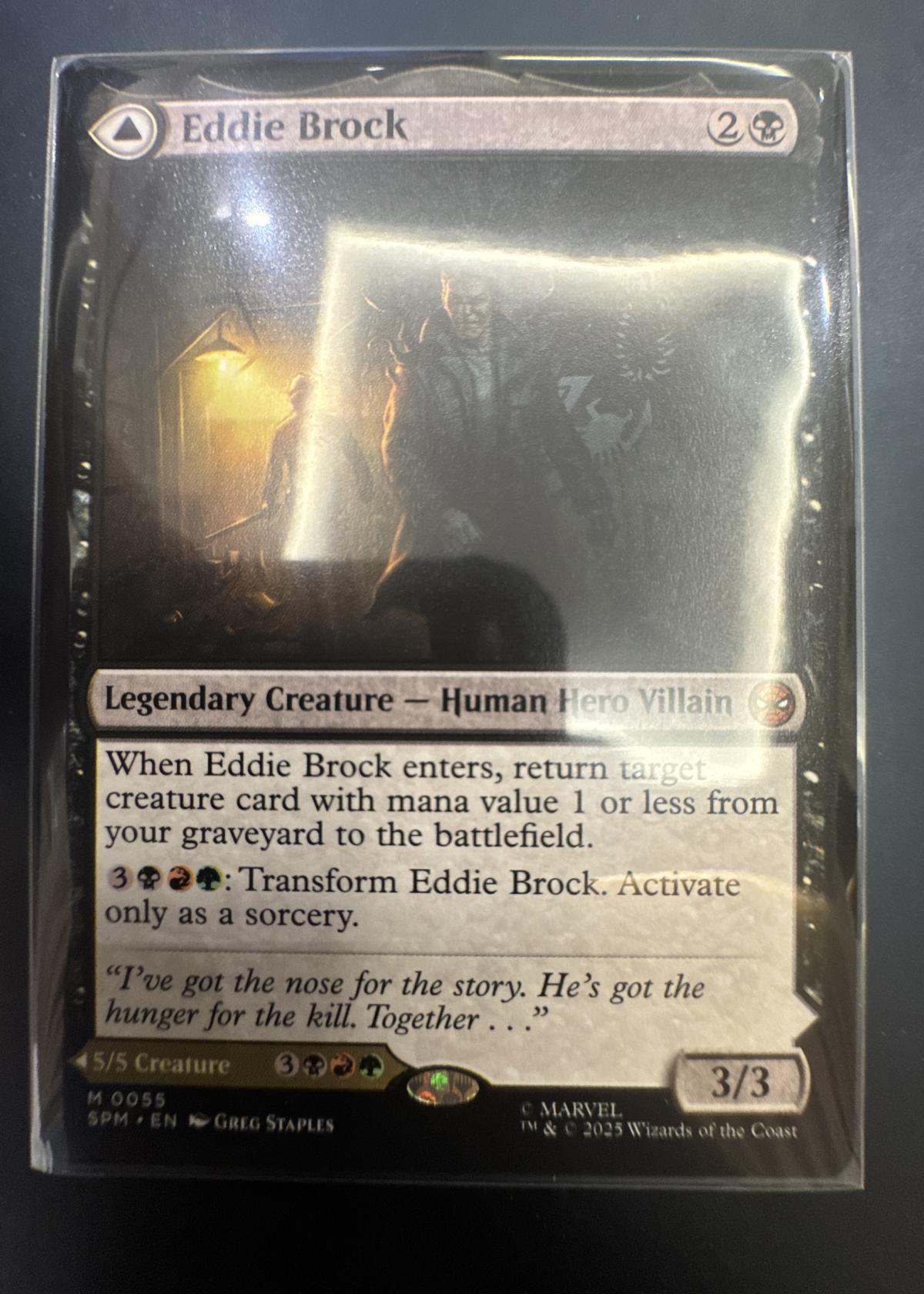 Eddie Brock is a Legendary Creature – Human Hero Villain from the Marvel crossover set for Magic: The Gathering. Illustrated by Greg Staples, this English-language card (SPM • EN) features special mechanics tied to graveyard recursion and transformation. This version is card number 55 from the set, and is a normal (non-foil) print. The card is mainly collectible, given its unique crossover and thematic appeal, though it may have creative uses in Commander or casual formats. Noted for its Marvel branding and 2025 Wizards of the Coast production.