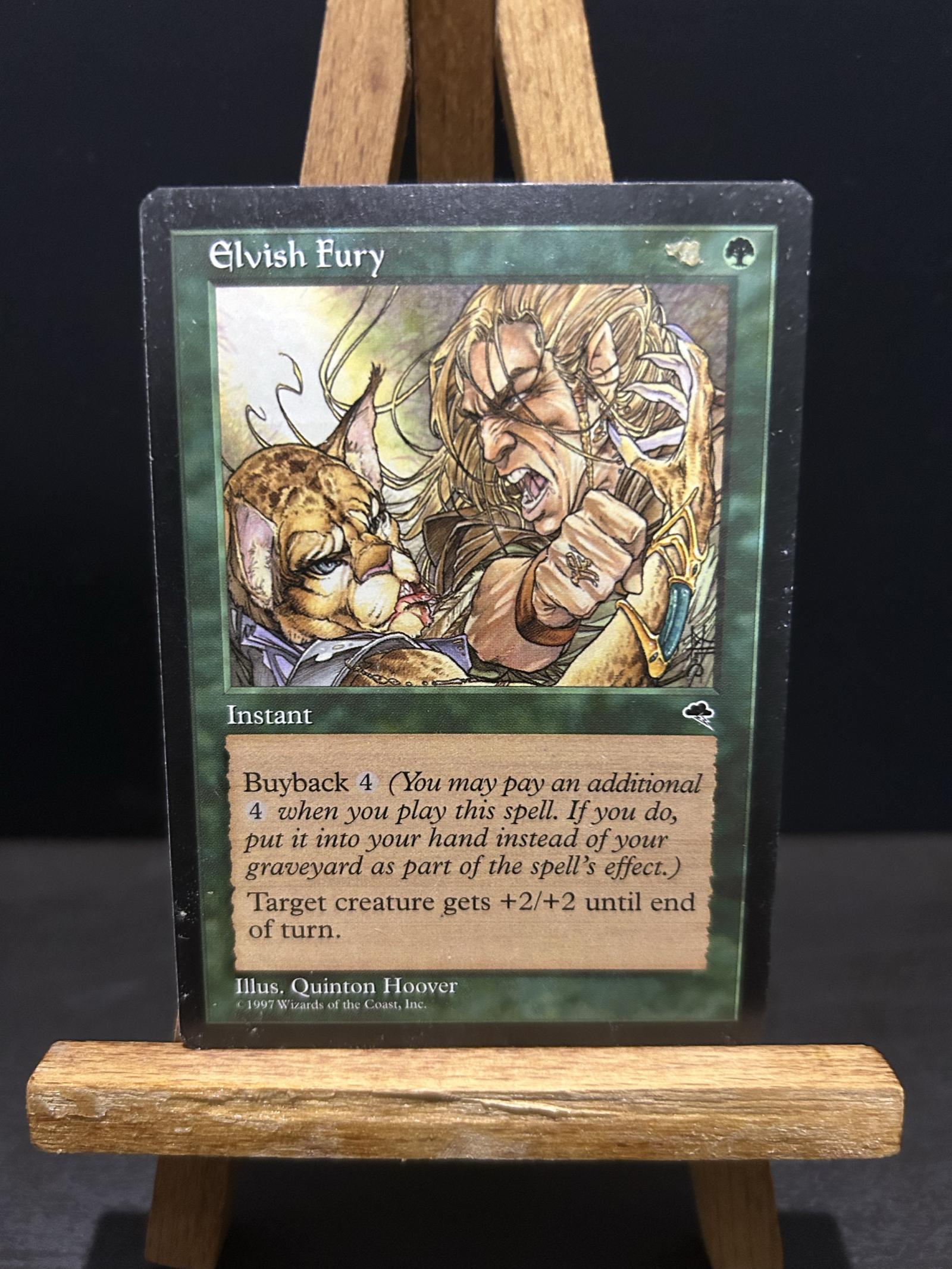 Elvish Fury is an instant card from the set The Dark (1997). Illustrated by Quinton Hoover, this card features the Buyback mechanic and grants a target creature +2/+2 until end of turn. It is a playable card mainly valued for nostalgic and collectible purposes rather than high meta play. This is a normal printing, English language card.