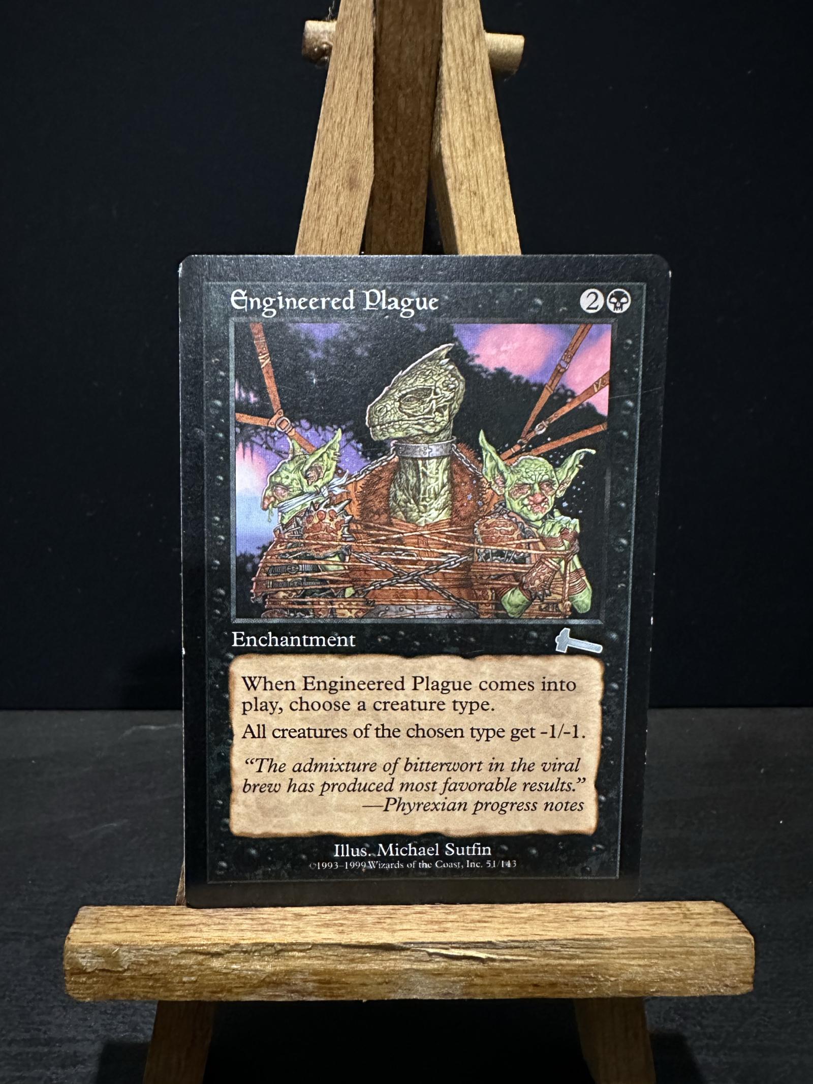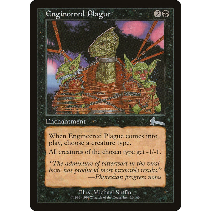 Engineered Plague from the Mercadian Masques set, illustrated by Michael Sutfin. This black enchantment card is a classic with impactful gameplay, allowing you to choose a creature type and give all creatures of that type -1/-1. Card number 51 out of 143. Language: English. Printing treatment: normal. A collectible and playable card in many casual and legacy formats.