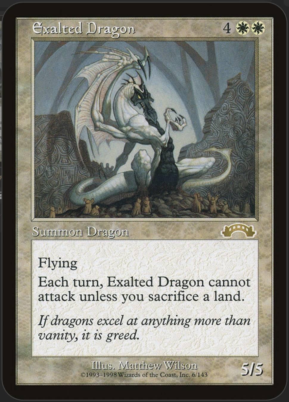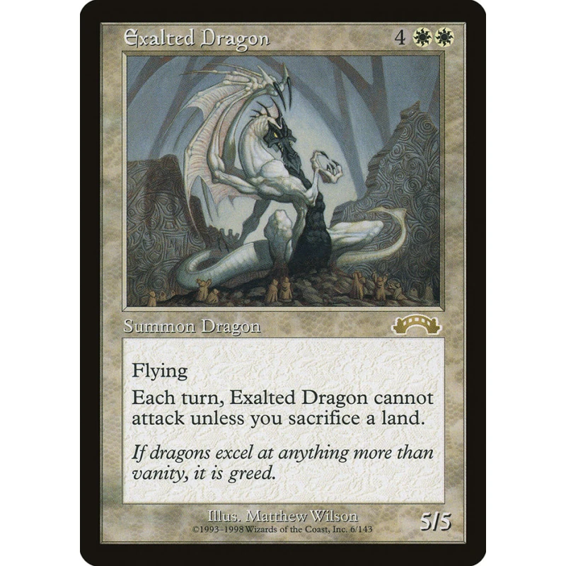 Exalted Dragon from the Portal set, illustrated by Matthew Wilson. This white rare dragon card has flying ability and a unique attack restriction requiring land sacrifice. Its collector number is 6/143. The card is a normal print and is mostly collectible given its older, niche gameplay relevance.