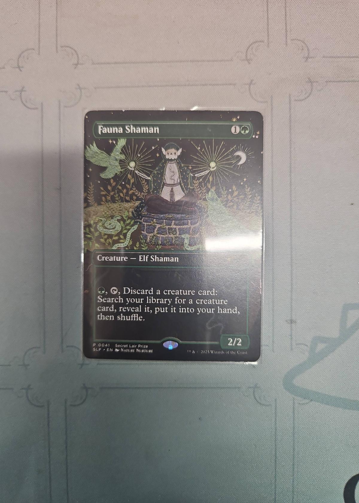 This is a foil Fauna Shaman from Secret Lair Prize, Nature Nurture (SLP) set. Card number 41. Playable in Modern, Commander, and other formats and often featured in competitive decks. English language. This premium edition features unique Secret Lair artwork and treatment. The card is ungraded and not slabbed.