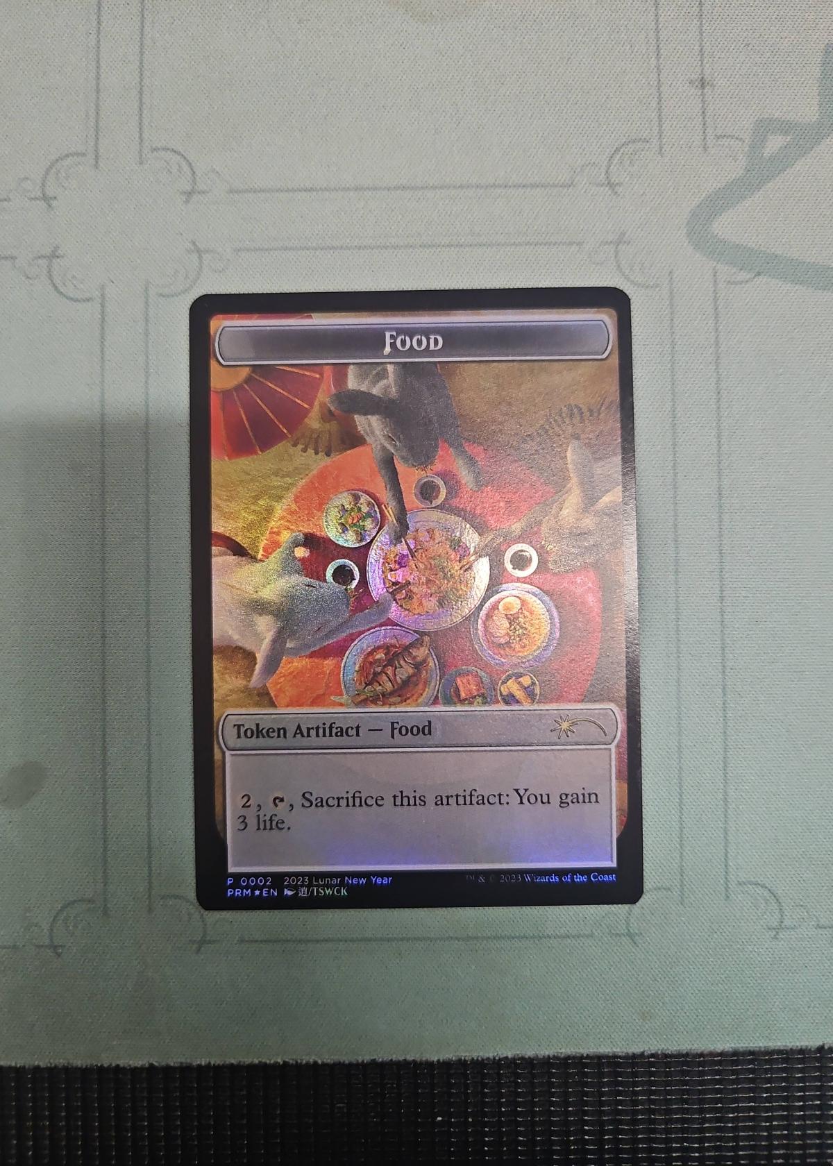 This is a foil Food Token (Token Artifact – Food) from the Magic: The Gathering 2023 Lunar New Year promotional set. The card features special Lunar New Year art, and the ability to sacrifice it for 3 life. The artist is LTSWCK, and the set code is PRM. This token is primarily collectible due to its unique art and limited Lunar New Year release.