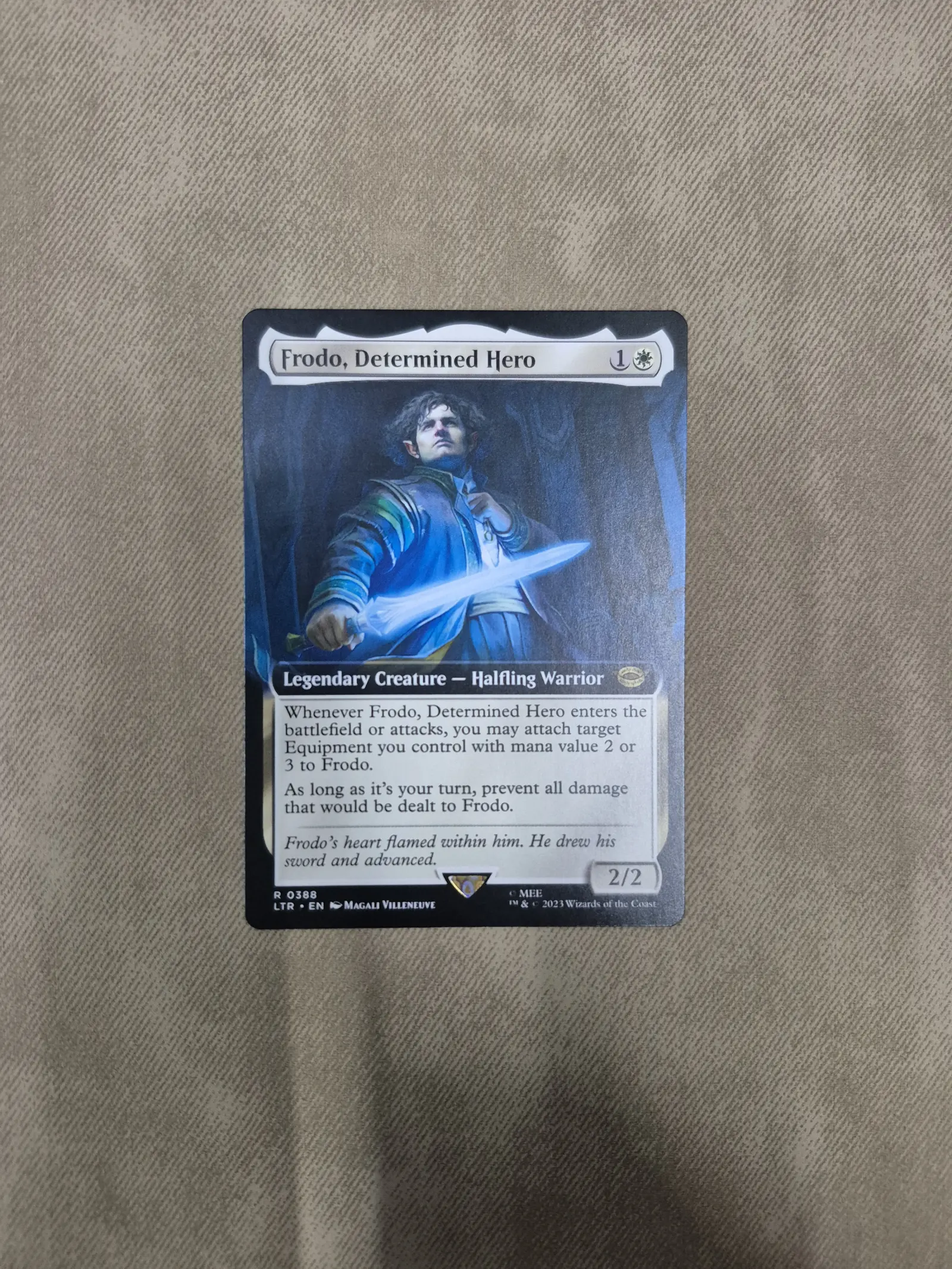Whenever Frodo enters or attacks, you may attach target Equipment you control with mana value 2 or 3 to Frodo.