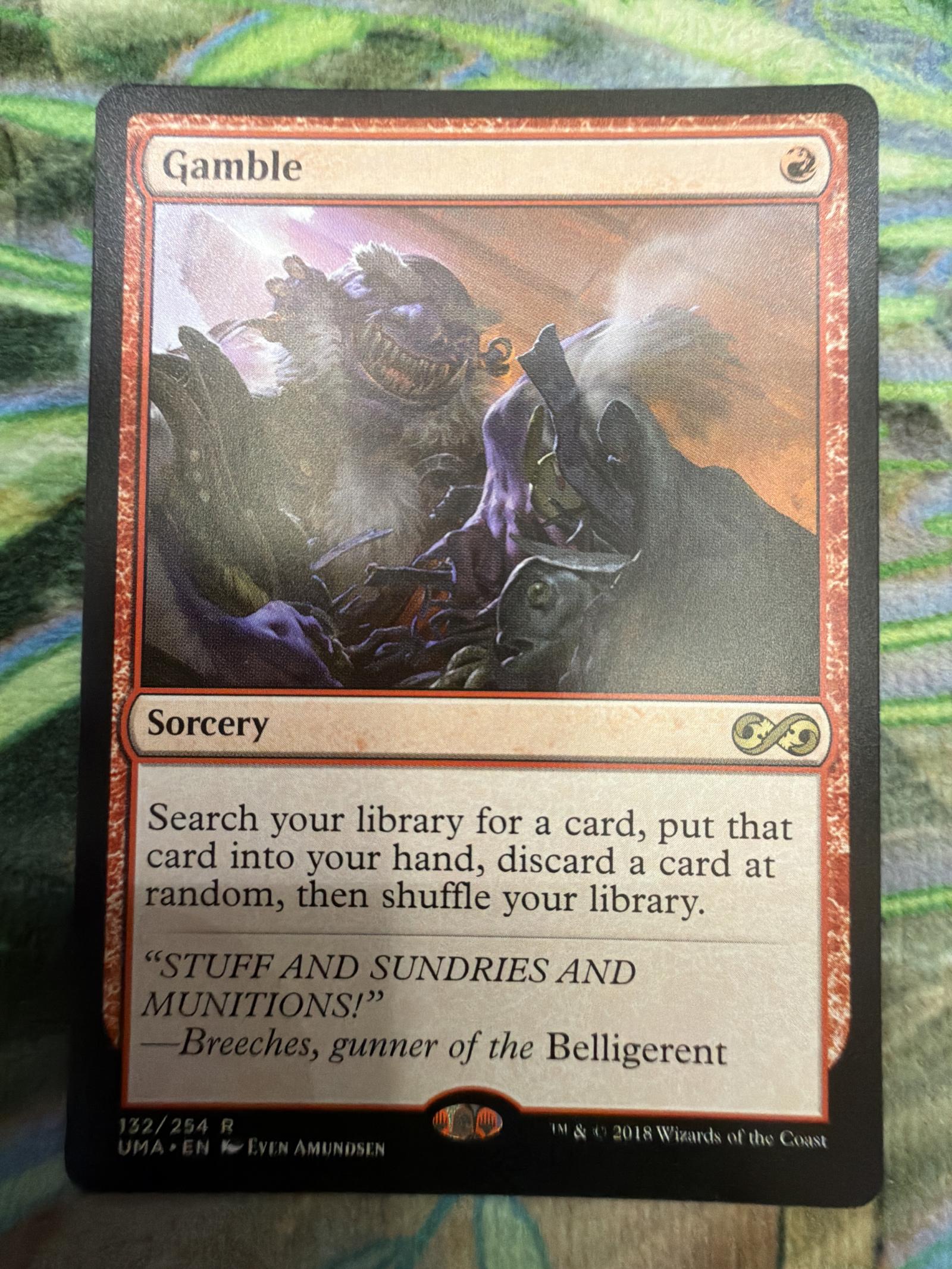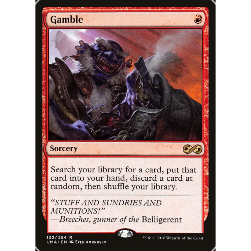 Gamble is a rare sorcery card from the Ultimate Masters set (UMA). The card text allows you to search your library for a card, put that card into your hand, then discard a card at random, then shuffle your library. Illustrated by Evlyn Amundsen. This card is in English and features no foil treatment. It is playable in various casual and Commander formats, offering strategic deck manipulation.