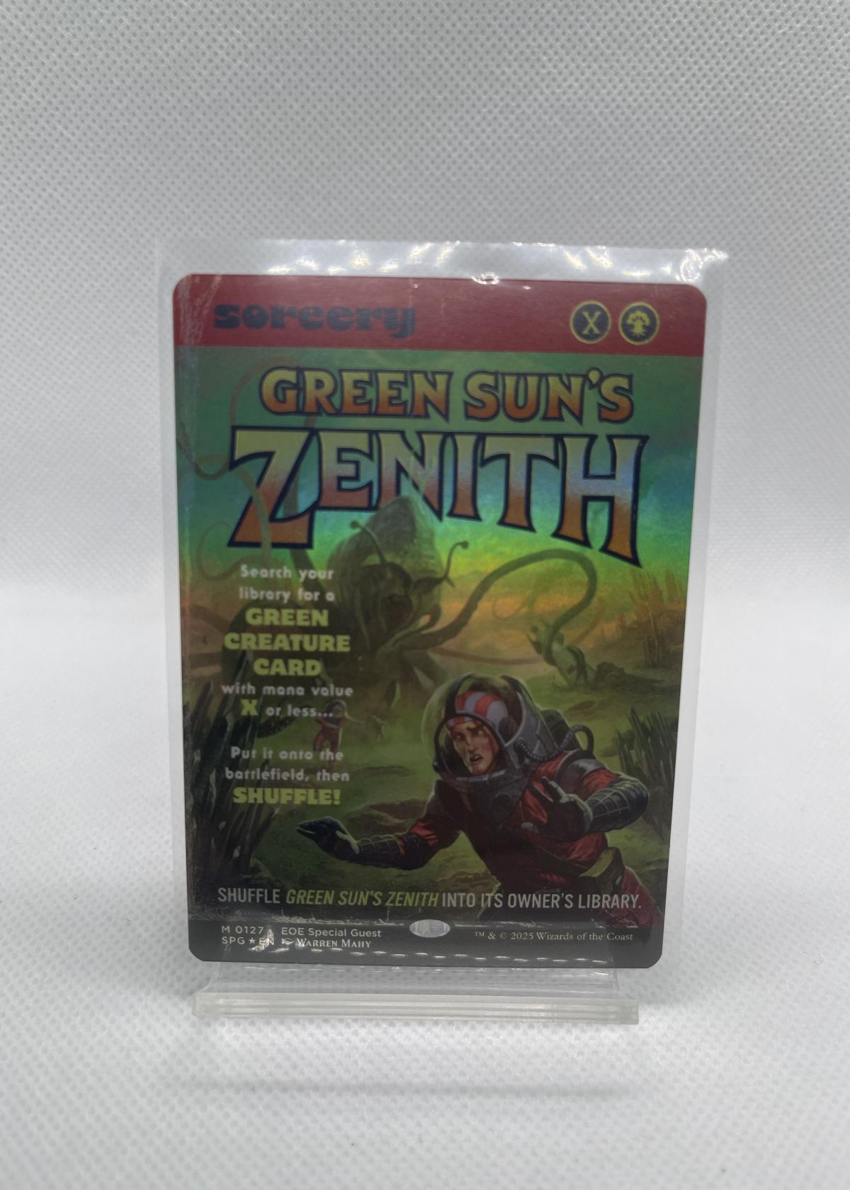 Green Sun's Zenith is a playable Magic: The Gathering sorcery card, known for its powerful ability to search for green creatures and put them directly onto the battlefield. This particular card is from the Special Guest subset of the EOE set (Encyclopedia of Everything) and is illustrated by Warren Mahy. The card features a foil treatment, making it especially collectible. Green Sun's Zenith is a staple in many competitive green decks. This version is in English.