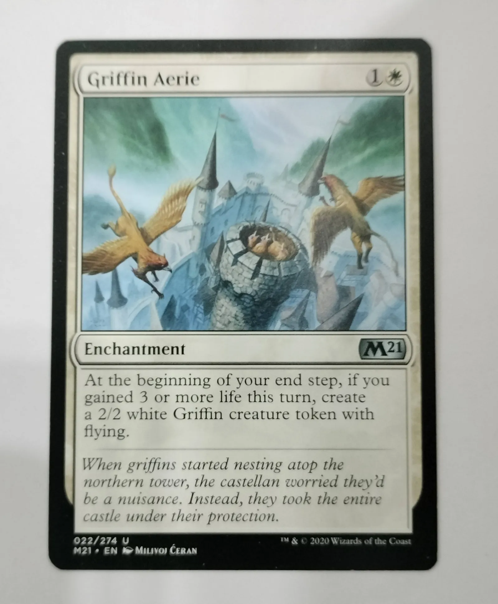 Griffin Aerie from the Core Set 2021 (M21), English language. Card number 22 out of 274. This is a non-foil enchantment card illustrated by Milivoj Ceran. It is a useful card in life-gain decks for creating flying Griffin tokens, playable in various metas that support enchantment synergy or life-gain strategies.