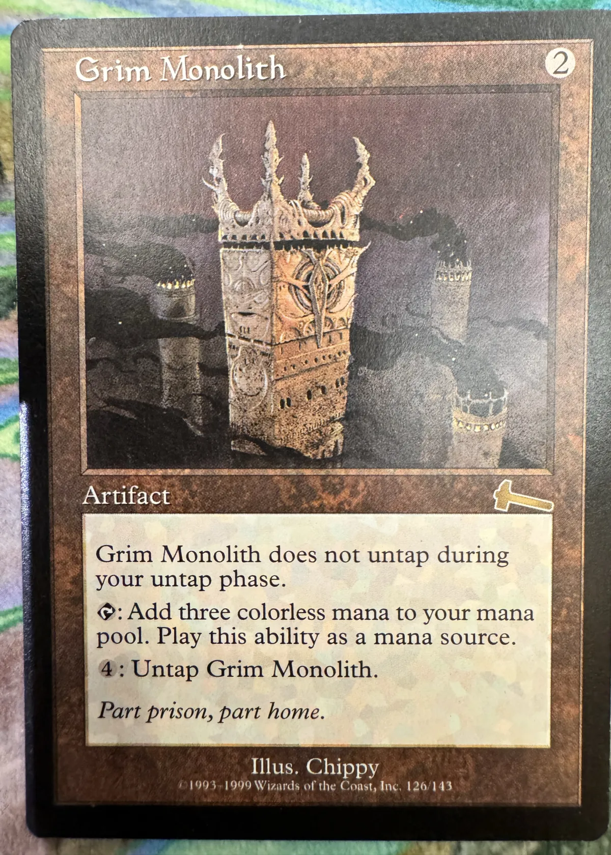 Grim Monolith is a powerful artifact card from the Magic: The Gathering set 'Urza's Legacy', illustrated by Chippy. It provides fast mana ramp and is highly sought after for competitive and Commander play, especially in fast combo decks. This particular card is from the original 1999 printing. Note: This card is not foil. Collector number: 126. Set: ULG (Urza's Legacy).