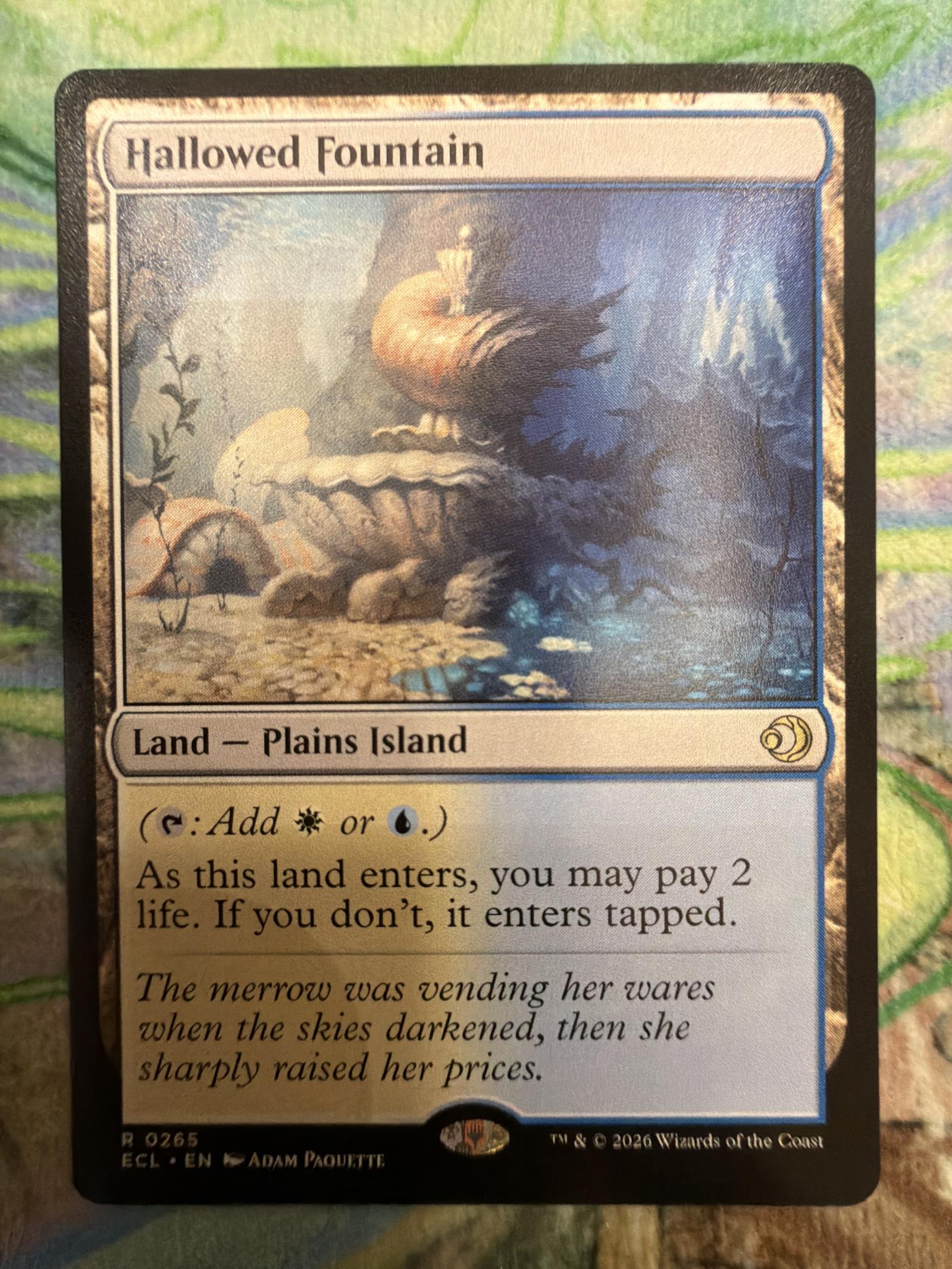 Hallowed Fountain is a dual land card from the set 'Eclipse.' It allows players to add white or blue mana and can enter the battlefield untapped if you pay 2 life. This card is illustrated by Adam Paquette and is printed in English. It is a non-foil card and is highly playable in many competitive decks due to its effective mana fixing and low downside.
