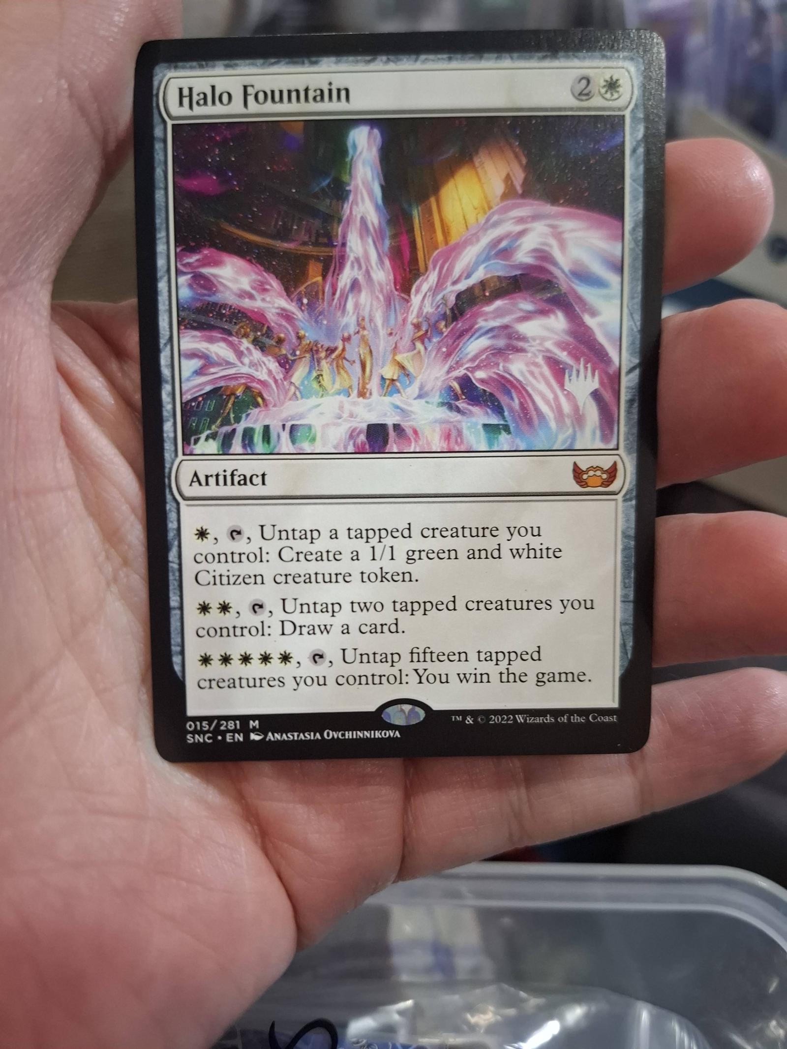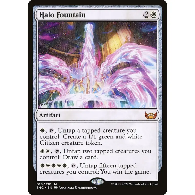 Halo Fountain from the Streets of New Capenna set (SNC). Card number 15 of 281. Illustrated by Anastasia Ovchinnikova. This is a normal printing. The card is an artifact with unique untap abilities enabling powerful token generation and card draw, making it playable in various deck metas as a strategic support card.