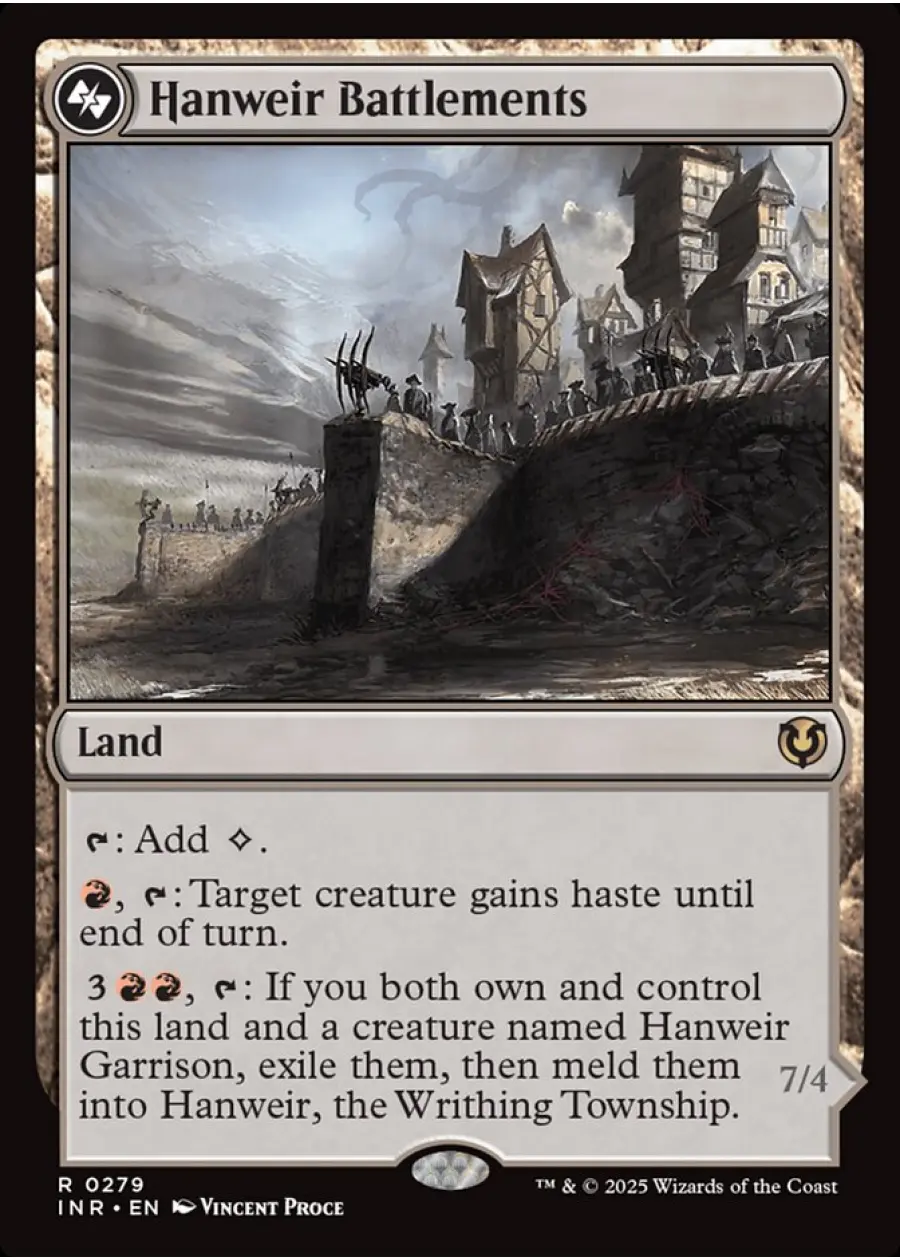 : If you both own and control this land and a creature named Hanweir Garrison, exile them, then meld them into Hanweir, the Writhing Township.