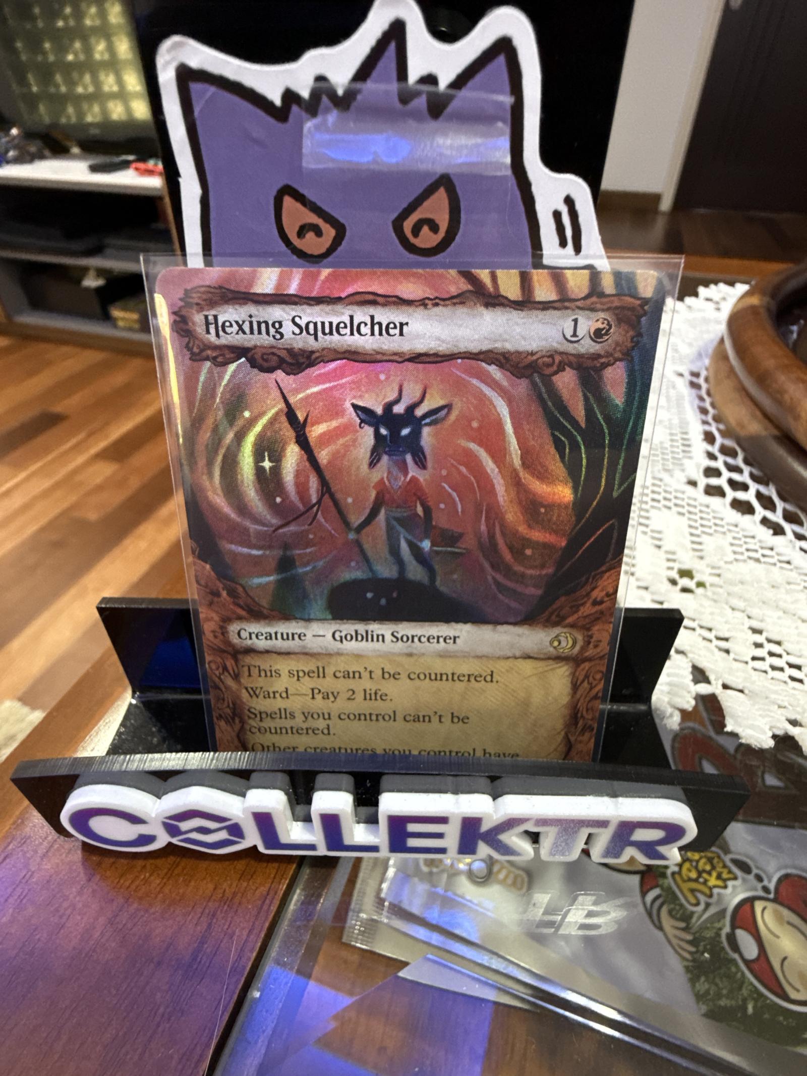 Hexing Squelcher is a rare creature card from the Magic: The Gathering set 'ECL' .It features a Goblin Sorcerer that provides counterspell immunity and ward abilities. This card is foil, adding collectible value. It is a vintage card playable in older formats but not commonly seen in modern competitive meta. The artwork and foil finish make it appealing to collectors and fans of legacy Magic cards.